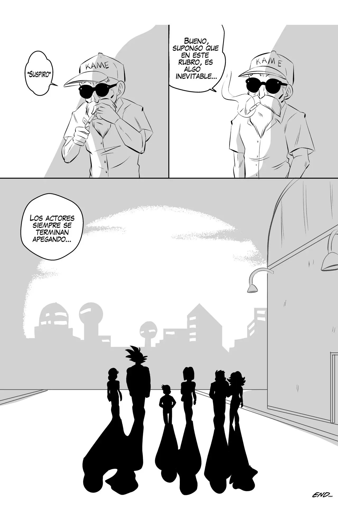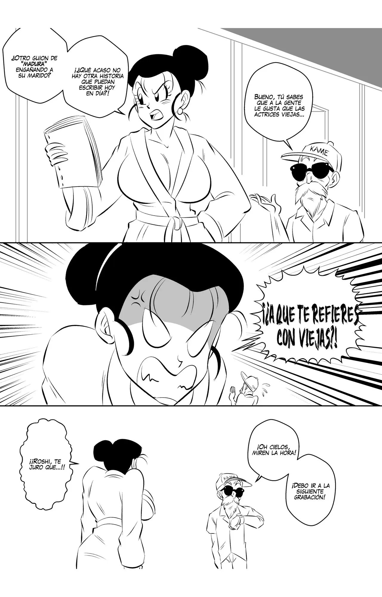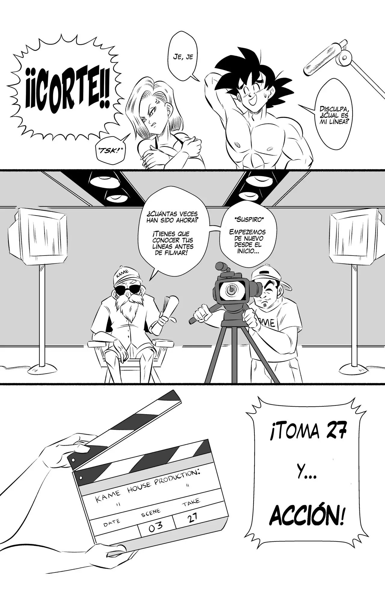 Pero en medio del calor de la escena, Goku se olvida su línea y deben hacer un corte. El Maestro Roshi, que es el director, lo reta porque ya es hora de que se aprenda las líneas, no pueden estar todo el día regrabando desde el inicio.