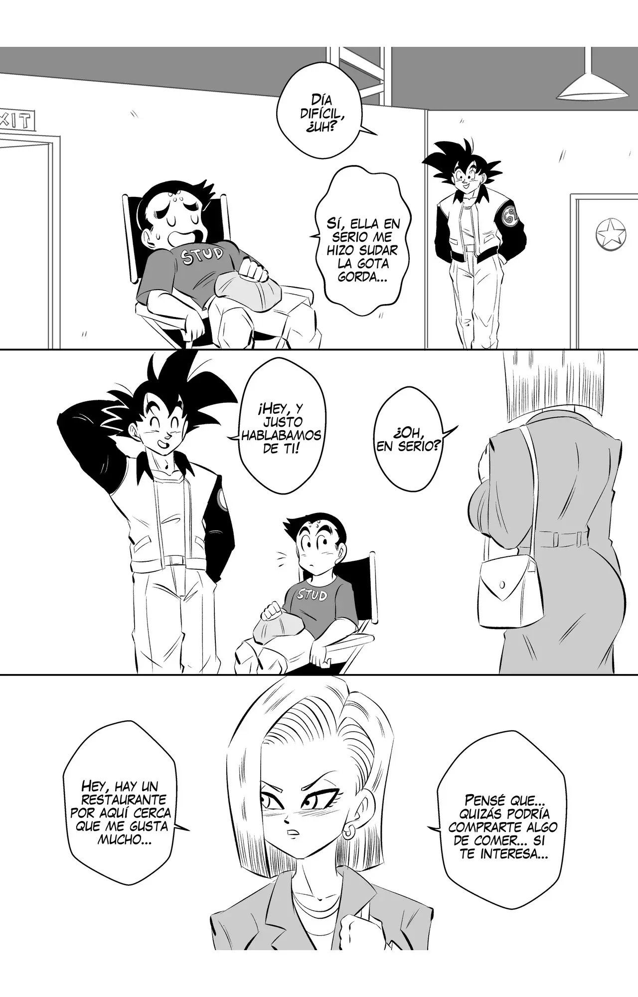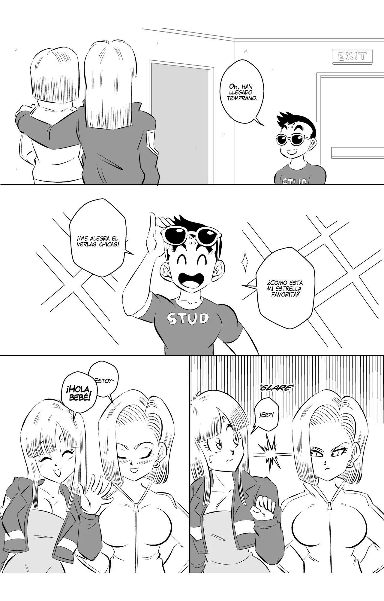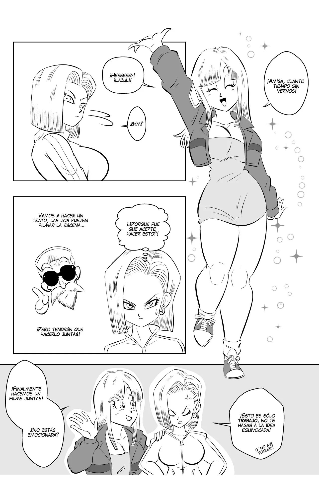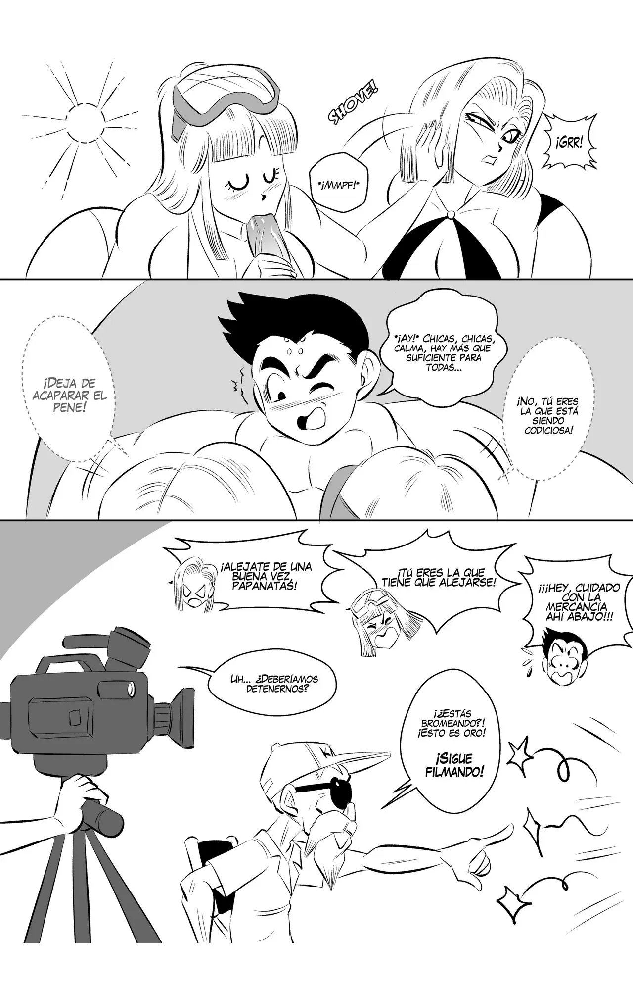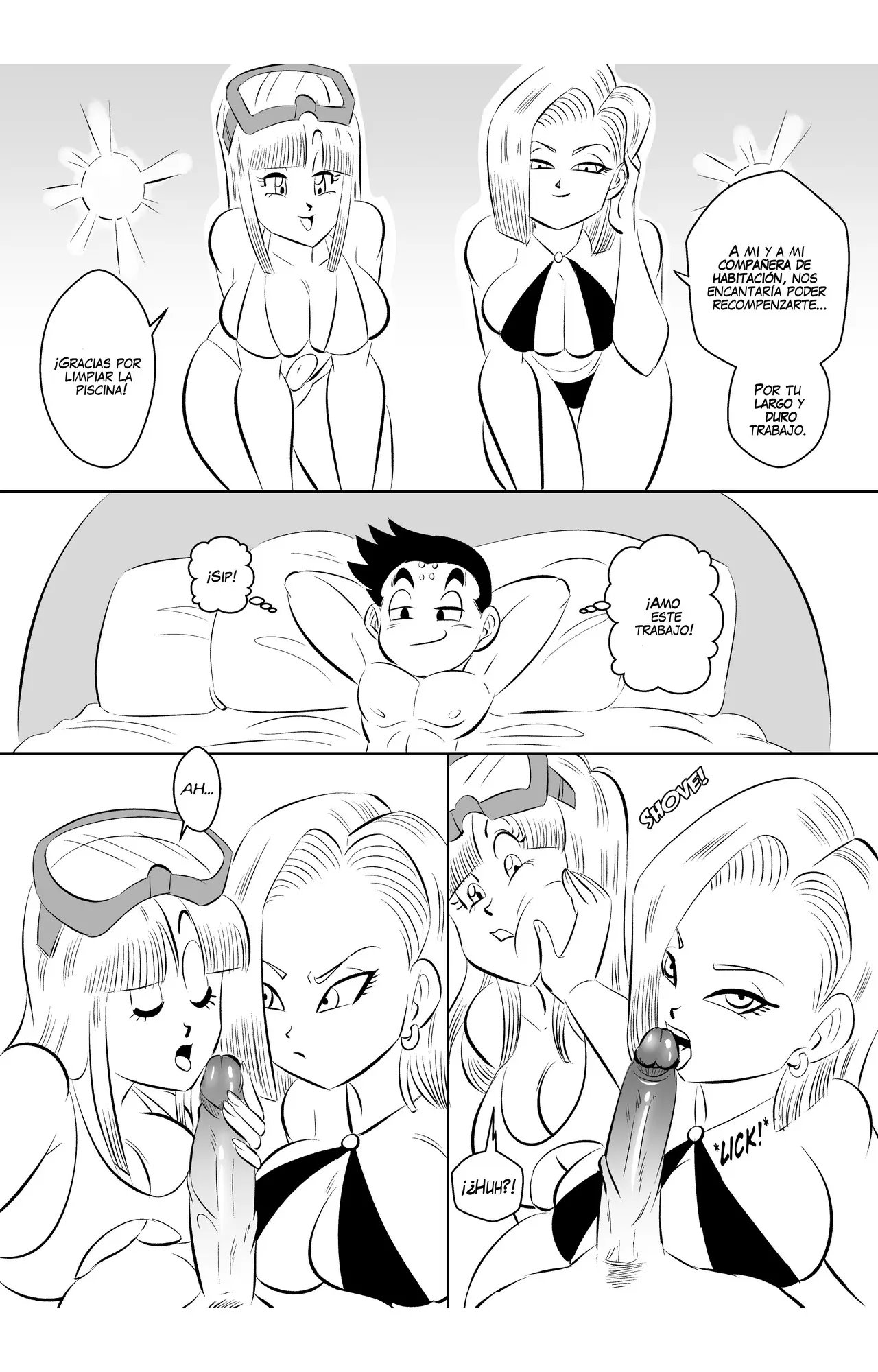 Número 18 ha conseguido otra escena, y esta vez con la ex de Krilin. Quien tendrá un trío con las dos chicas a pesar de los celos de la androide. Una escena donde las dos mujeres llevan traje de baños candentes, y planean recompensar al limpiador de la piscina con sexo. Que no sale tan bien como estaba planeado porque las dos pelean por ver quién se come el pene del chico. En otra situación hubieran detenido la escena, pero a Roshi le gusta como van las cosas.