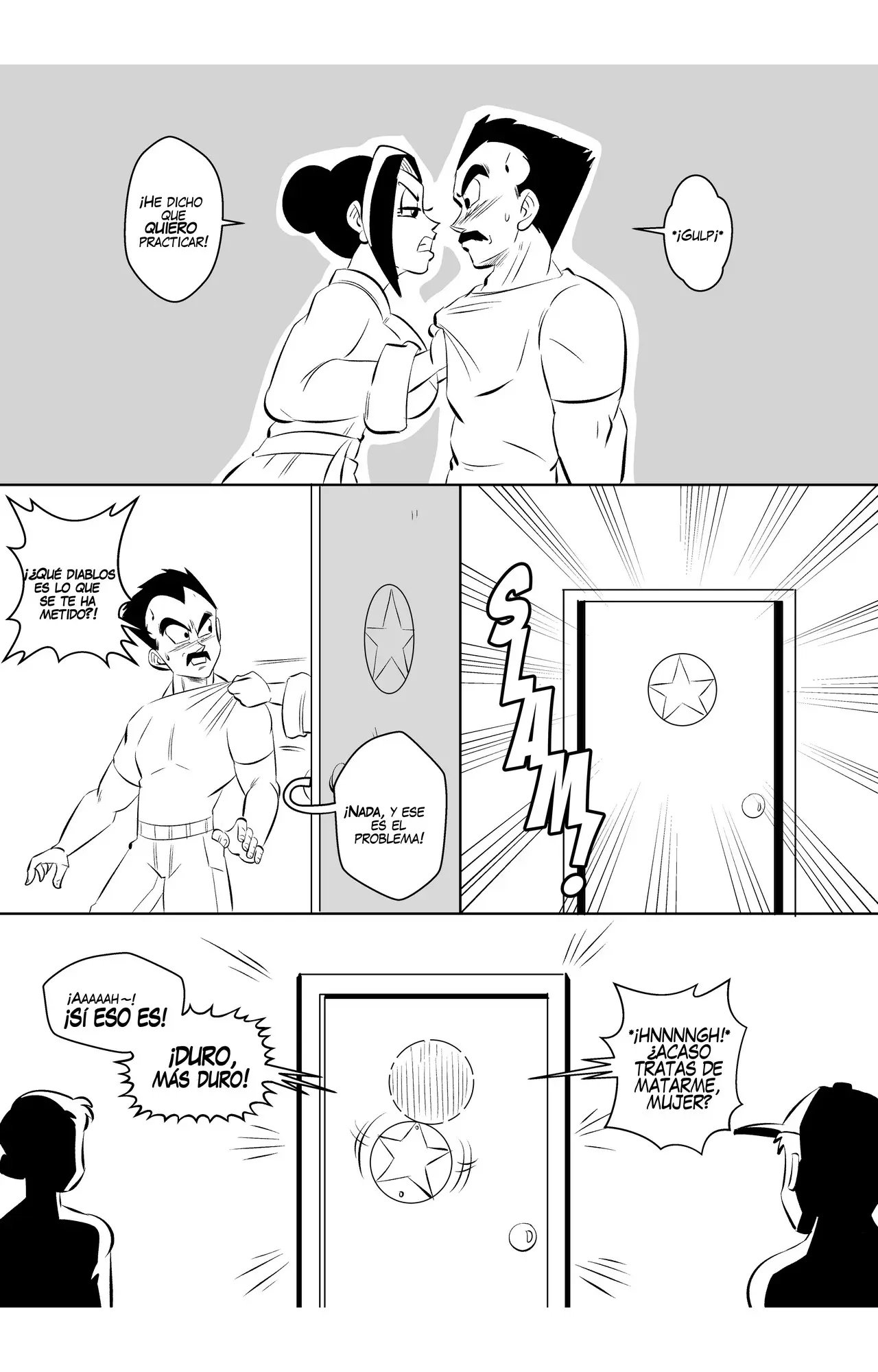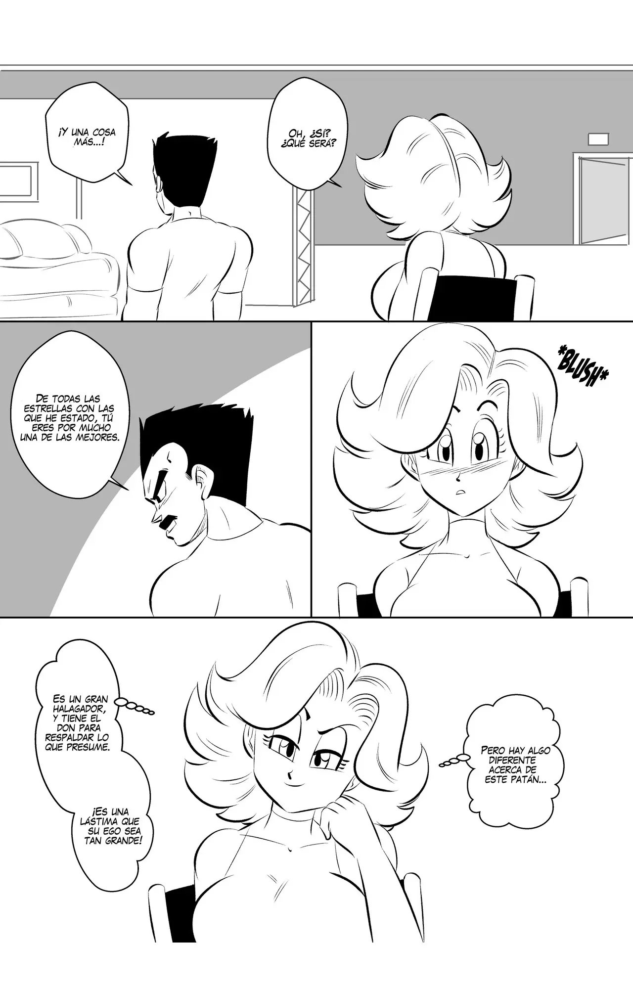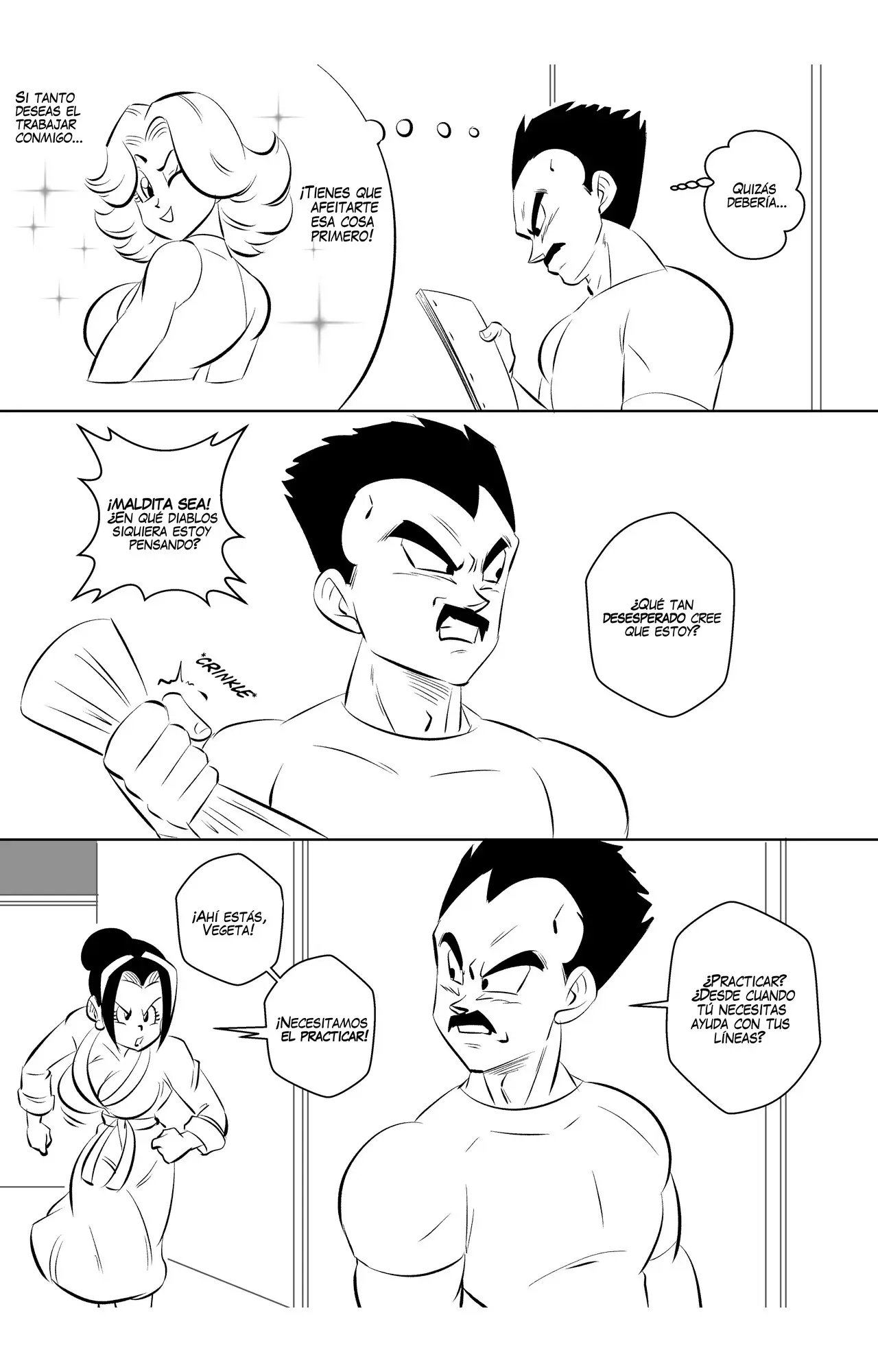 Vegeta lee su próximo guion y por fin le toca una escena con Bulma. Lo que le recuerda que la última vez que la vio ella dijo que solo grabaría con él si se afeita su bigote. Pero pronto llega Milk que le dice que necesitan practicar, y no son precisamente sus líneas. Así lo hacen en el camerino, donde Vegeta acaba muy cansado luego de dársela duro, como le pidió Milk.