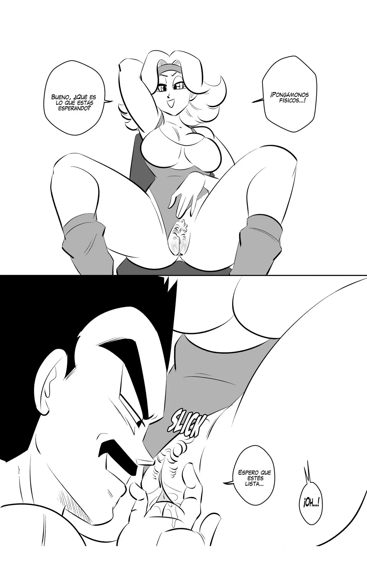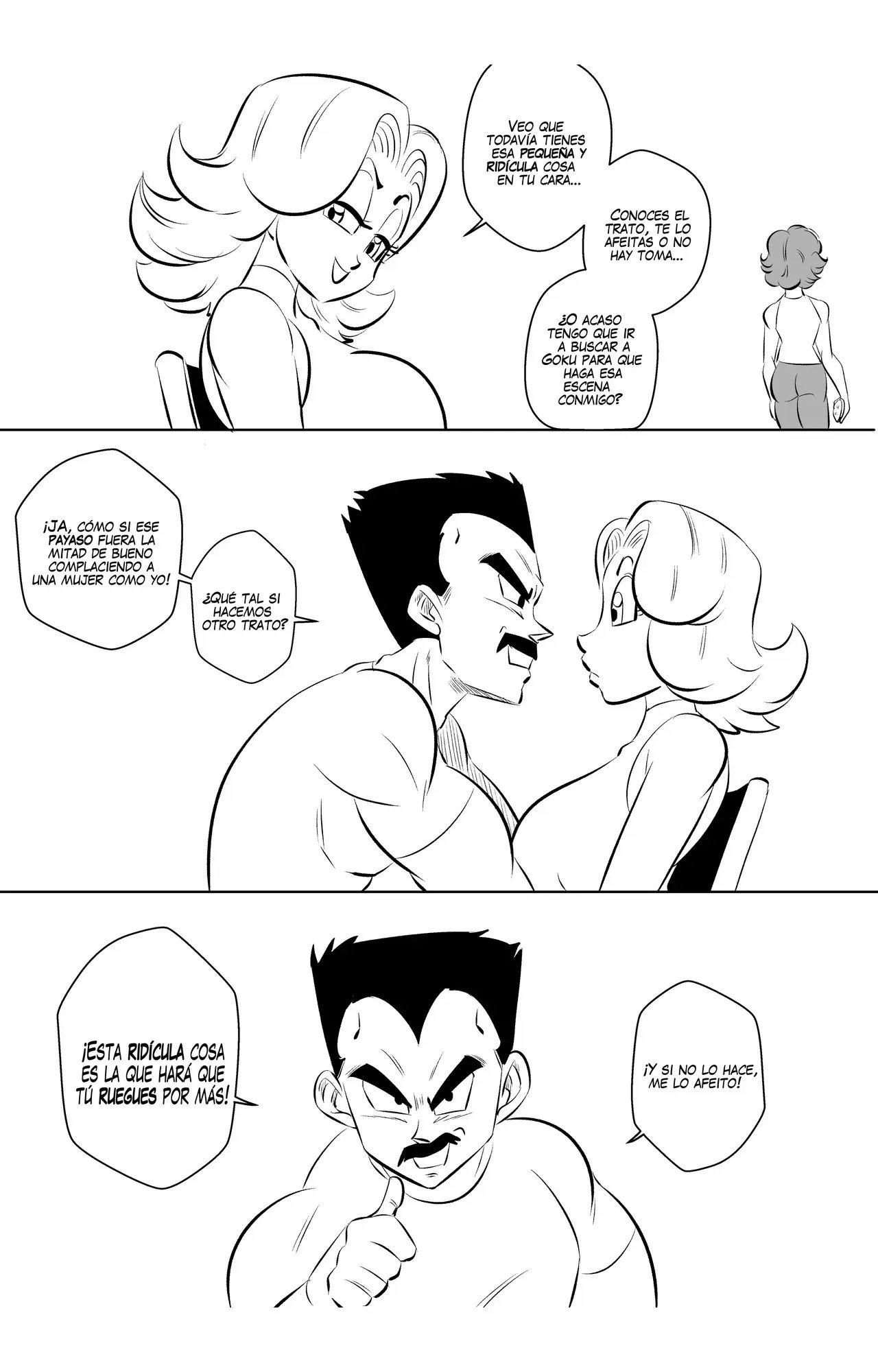 Bulma se está maquillando para su escena con él y espera que le haya quedado algo de energía. Ella recuerda sobre su trato de afeitarse el bigote, pero Vegeta tiene un trato mejor, que si no la complace y la deja rogando por más, se lo quitará.
