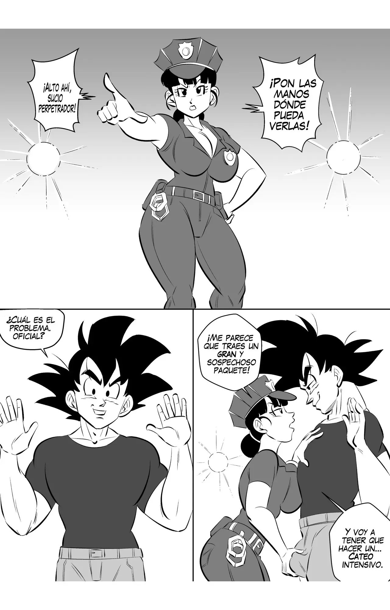 En cuanto a Goku y Milk, la escena es de ella siendo una policía y arrestando a él. Le pide que ponga las manos donde las pueda ver, mientras que le informa que lo ha arrestado por llevar un paquete sospechoso. Al que trata de manera ilegal, porque lo ha atado a la cama y no le deja hablar. Va a examinar la evidencia usando su coño, y por eso se sube para probarla. Que al ser un arma escondida, va a tener que pasar un tiempo muy duro tras las rejas.