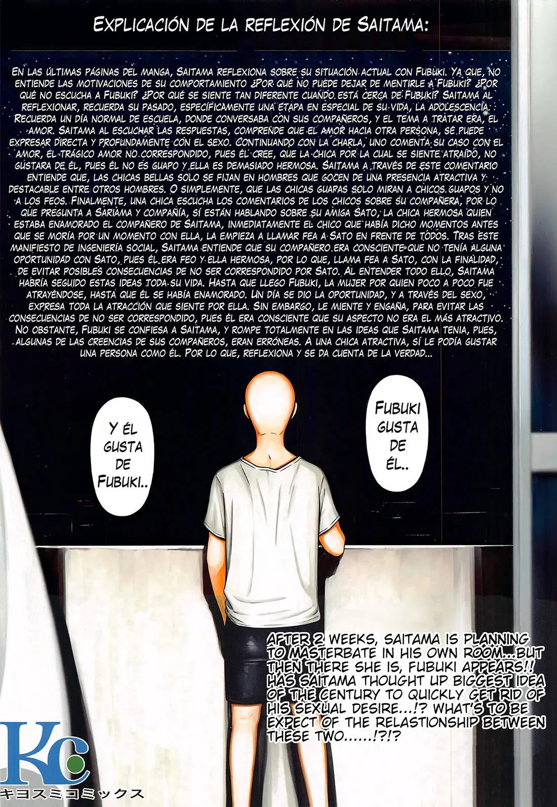 Eso hace que Fubuki salga furiosa del apartamento de Saitama y este se quede hablando con Genos acerca de qué significa que te guste una chica. Algo que el protagonista y un androide tienen dificultades para expresar. Más aún Saitama cuando sabe que se siente diferente con ella, pero por alguna razón no puede decírselo.