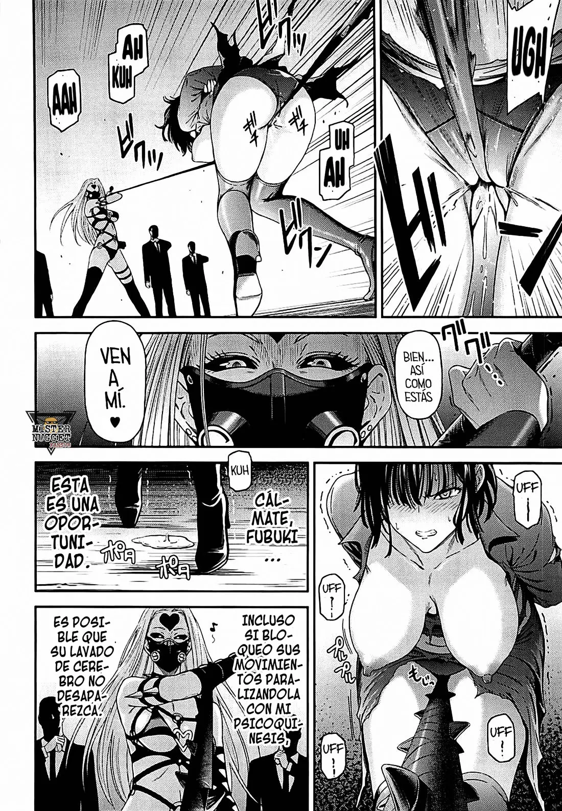 Ahora Fubuki es sostenida por sus subordinados, que le abren las piernas. Solo para que Do-S le aparte las bragas y vea lo rosada que es en su interior. Así puede mostrarle otra de las funciones de su látigo, ya que el mango también puede ser utilizado como dildo. Fubuki podría usar sus poderes psíquicos para detenerla, pero parece que lo está disfrutando y se deja.