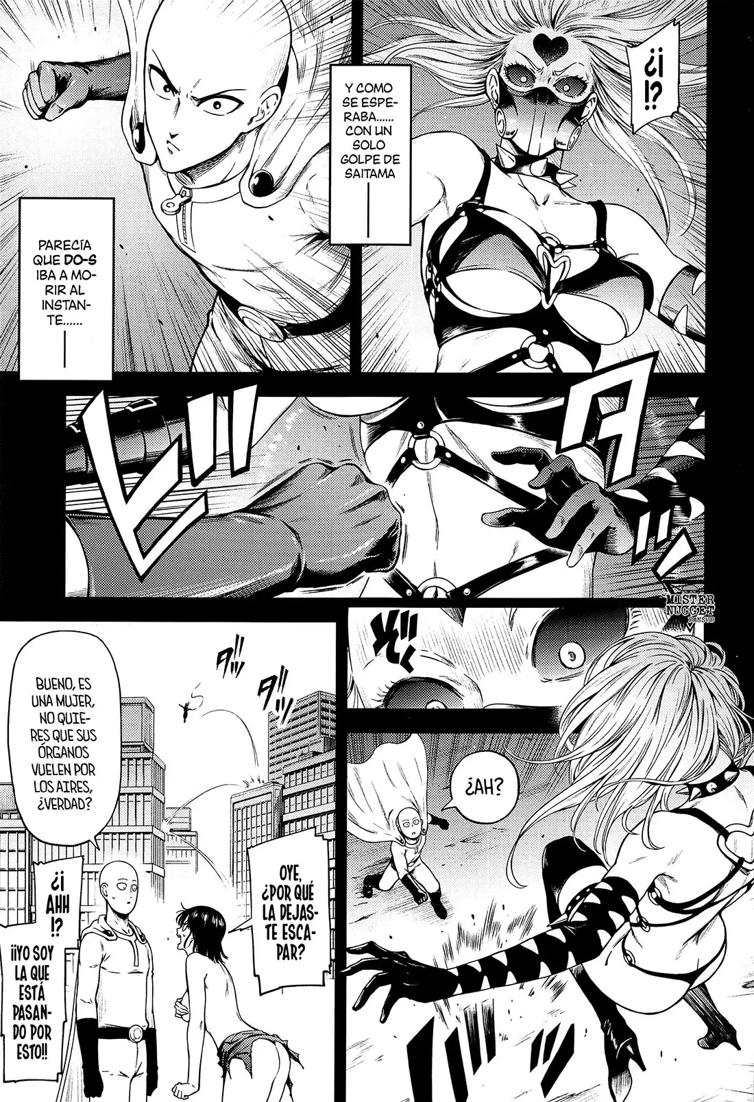 Tiene suerte de que haya llegado Genos y piensa que ella está atacando al maestro. Lanzándole su ataque y dejándola inconsciente y con todo el semen de Saitama chorreando de su coño.