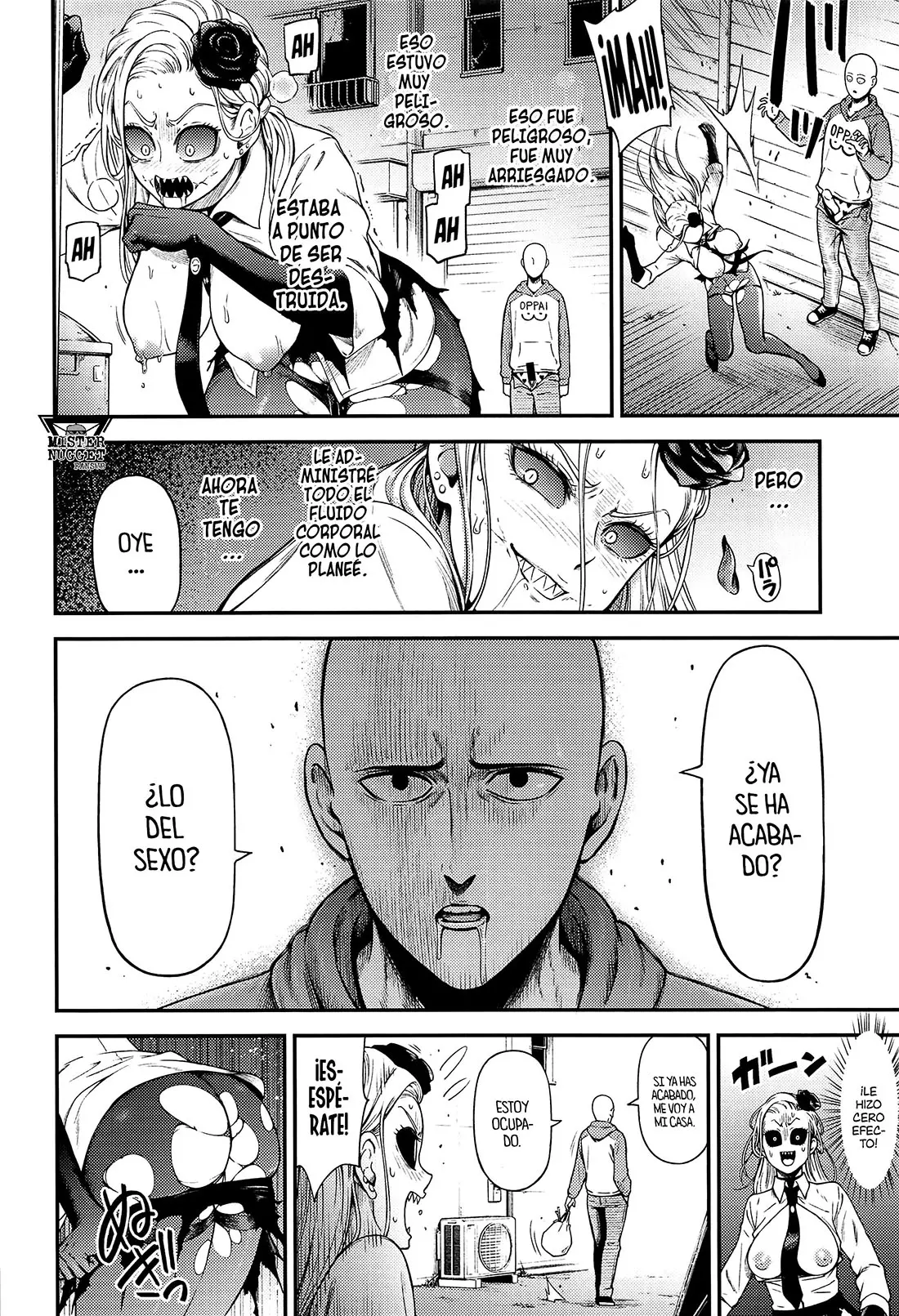 Luego Saitama la pone sobre un contenedor y vuelve a follar su coño. Ante los imploros de Do-S, que le dice que sea más gentil y que vaya despacio. Lo cual no está nada bien para él, porque si lo está disfrutando, cuanto más duro se lo haga, más rico será.