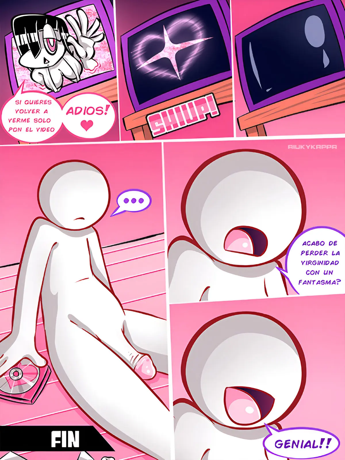 Ahora ha terminado exhausta, con su cabeza en blanco. Está toda pegajosa con semen por todo su cuerpo. Por suerte, Sadako es un fantasma y puede quitárselo con un chasquido de dedos. Así puede regresar a la TV y seguir atormentando víctimas. Dejándole como regalo un video diferente al original, que lo vuelve inmune a la maldición en caso de que vea por error la cinta.