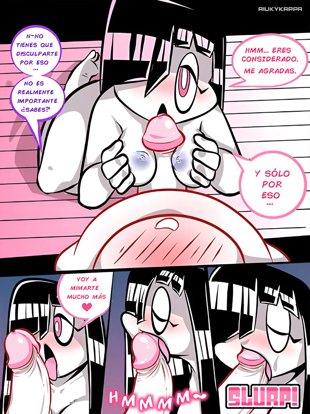 Tampoco había sentido el olor y el sabor de una polla dura. Pidiéndole disculpas a su “víctima” porque sus tetas no son tan grandes para un paizuri, pero igual lo intenta. Sin embargo, el chico le dice que no es importante que sus pechos sean grandes, lo que es agradecido por Sadako. Eso le ha ganado más mimos de su parte.