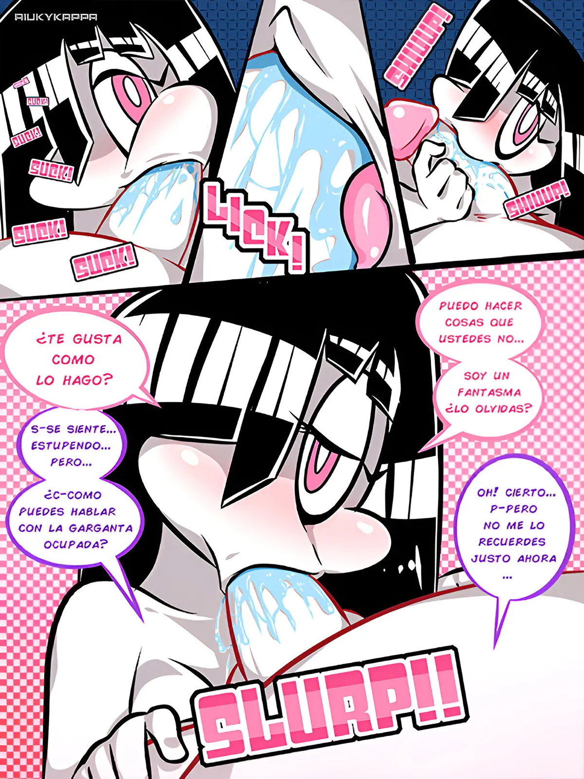 En medio de la mamada, la polla es tan grande que puede sentirla palpitando dentro de su garganta. Una sensación estupenda. Que se debe a que ella es un fantasma y puede hacer cosas que los humanos no, como meterla completa por la garganta. Por eso no hace tiempo de avisarle antes de darle una enorme carga de leche que le hace preguntar a Sadako dónde la tenía guardada.