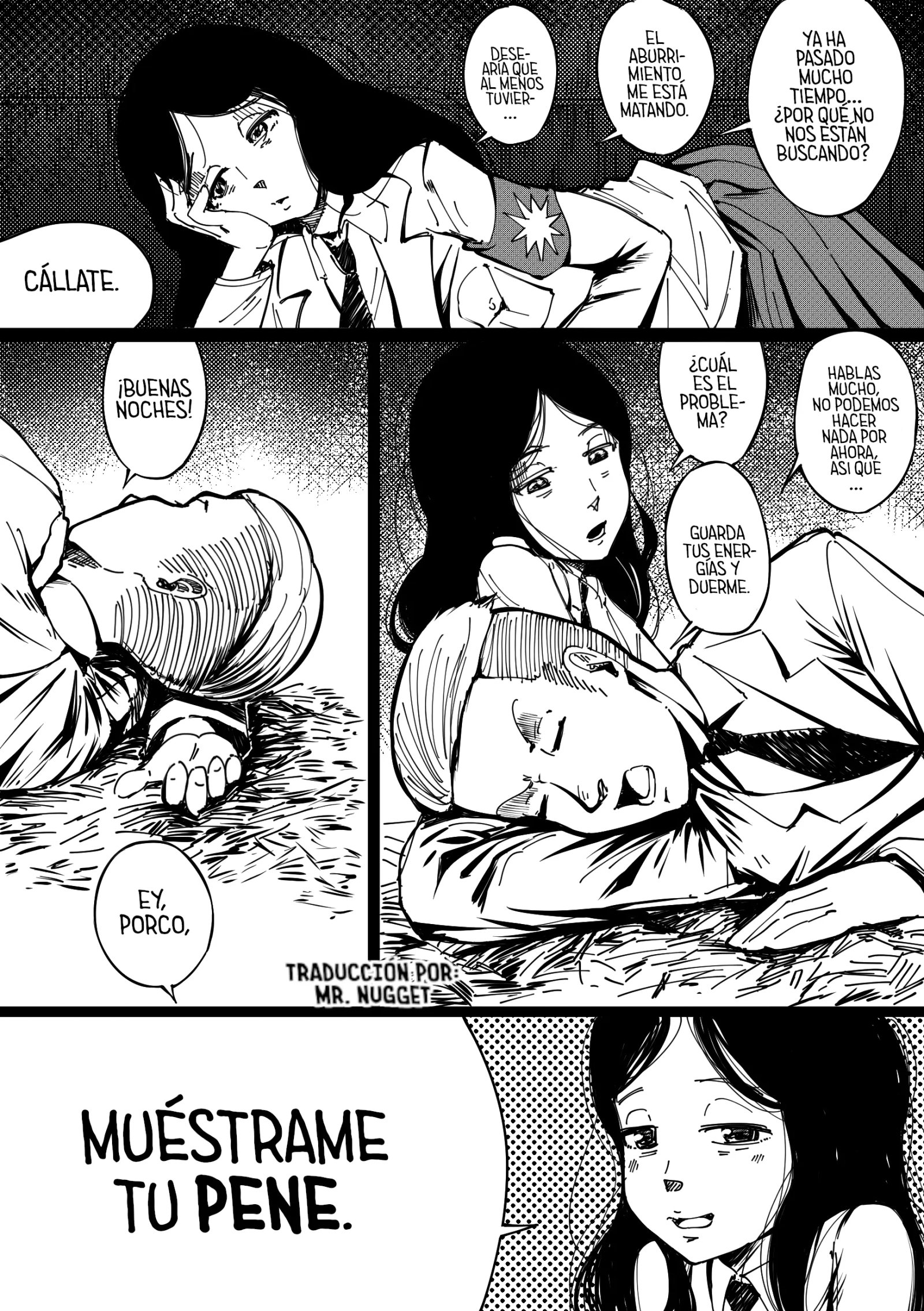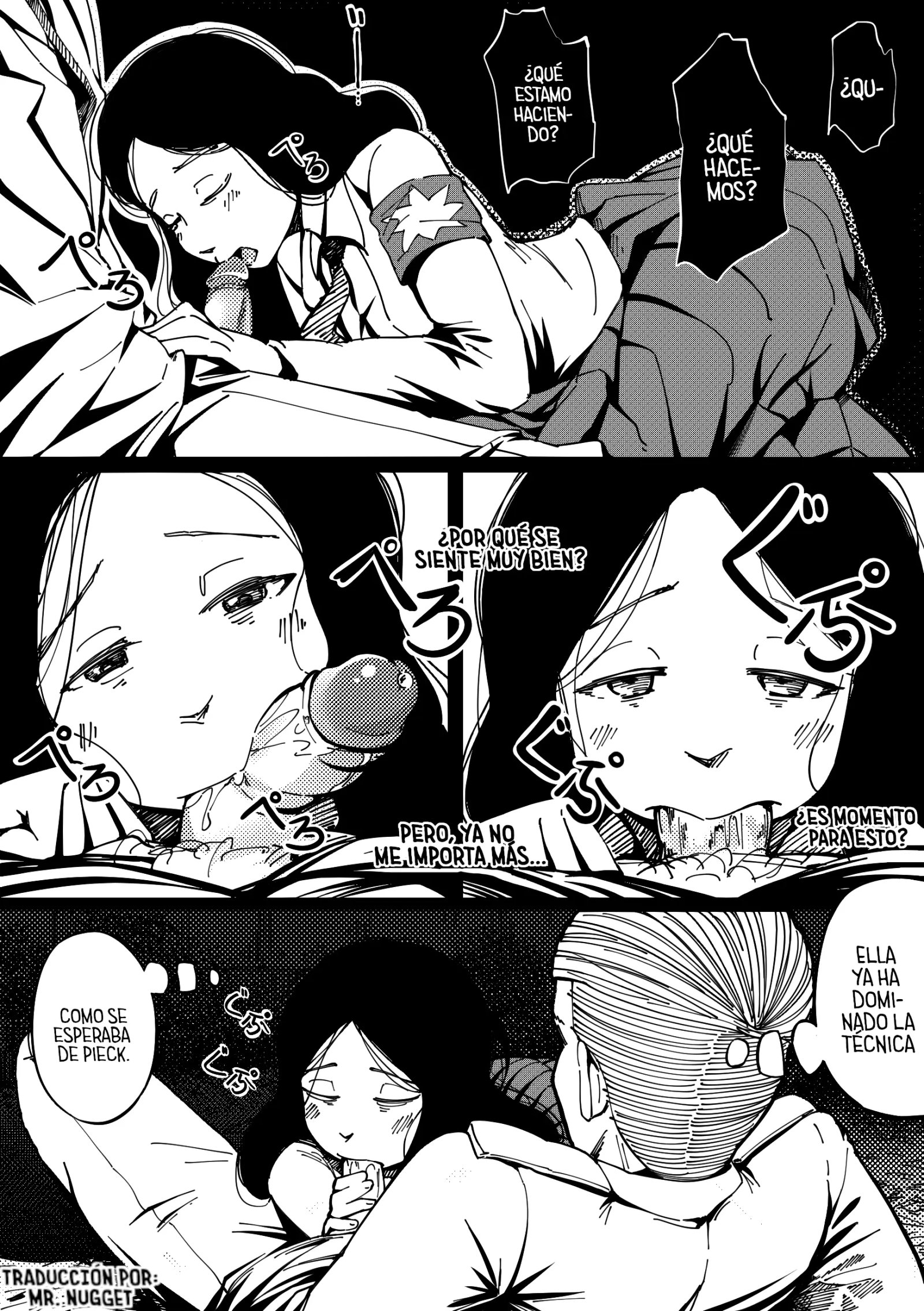 Porco está sorprendido, porque no puede creer que está haciendo eso. Aunque Pieck tiene un argumento muy sólido, que es el hecho de que si salen de allí, aún le quedan dos años, y es mejor que experimenten un poco para sacarse la curiosidad. Si no salen de allí, al menos podrán aprovechar el tiempo al máximo las próximas horas que les quedan. Así que Porco le dice que lo entendió y le deja que le coma la verga. Él solo tiene que recostarse, ya que ella se encargara del resto.