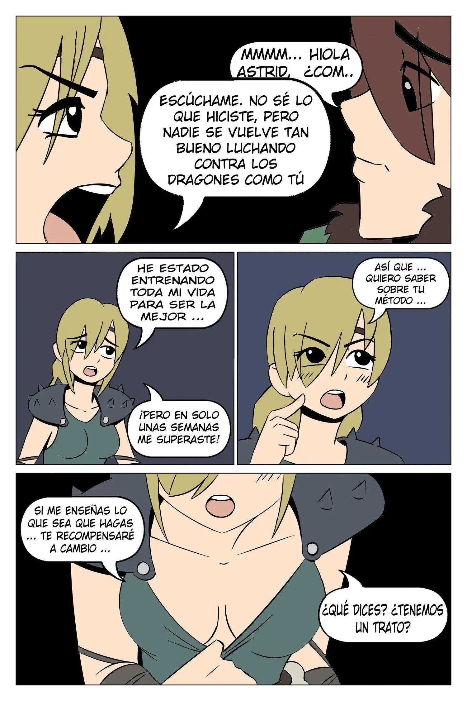 Hipo le dice que le enseñara, pero si solo va con él a su casa. Allí la chica se quita todo y le dice que es mejor que no se acostumbre a eso porque será cosa de una sola vez. Lo que para Hipo es más que suficiente. Astrid le pide que se relaje y se arrodilla para comerle la polla. Lo que hace que este vikingo se corra rápido en su boca. Y no solo le dejé los labios pringados, también los dedos. Dedos que ella chupa para probar de su semen.