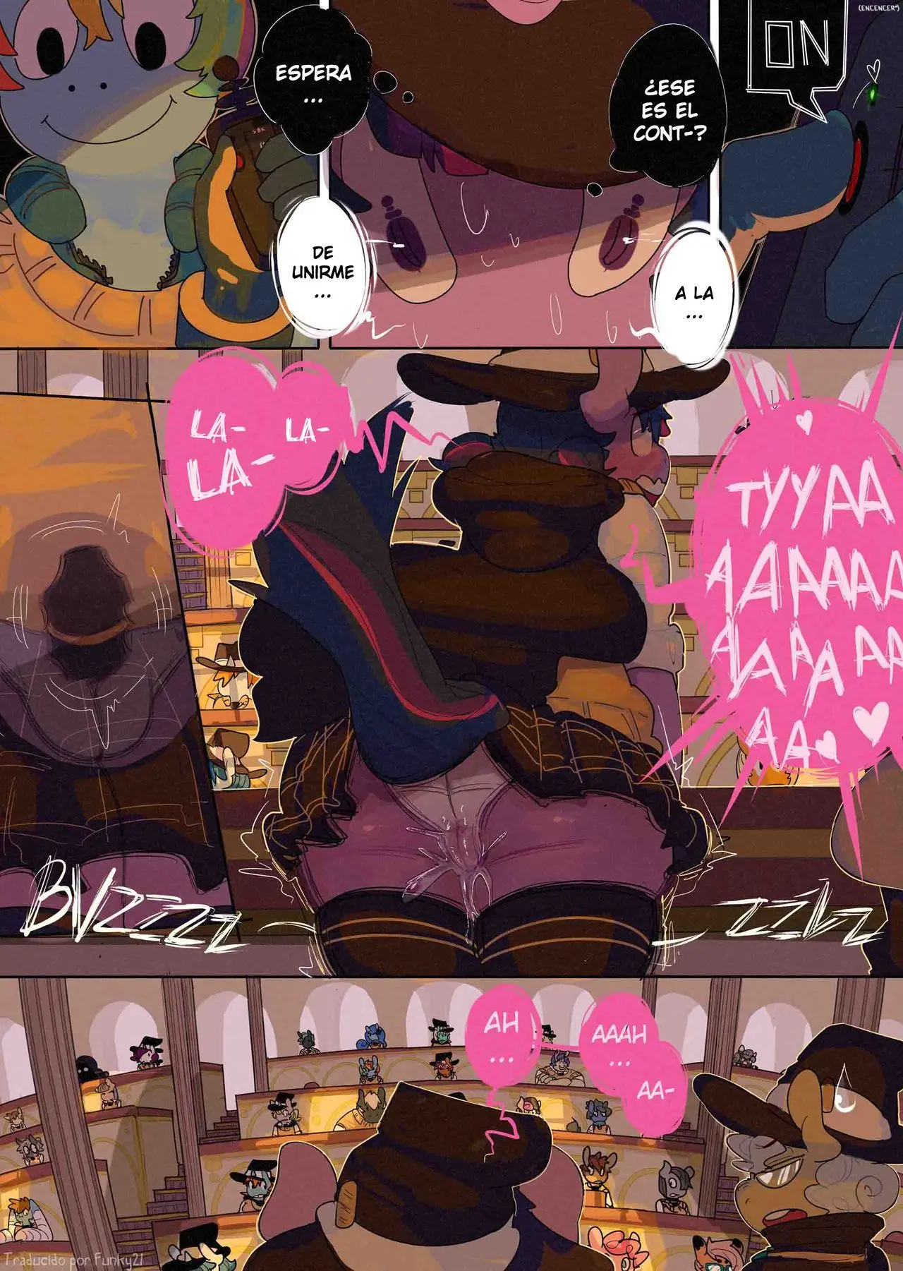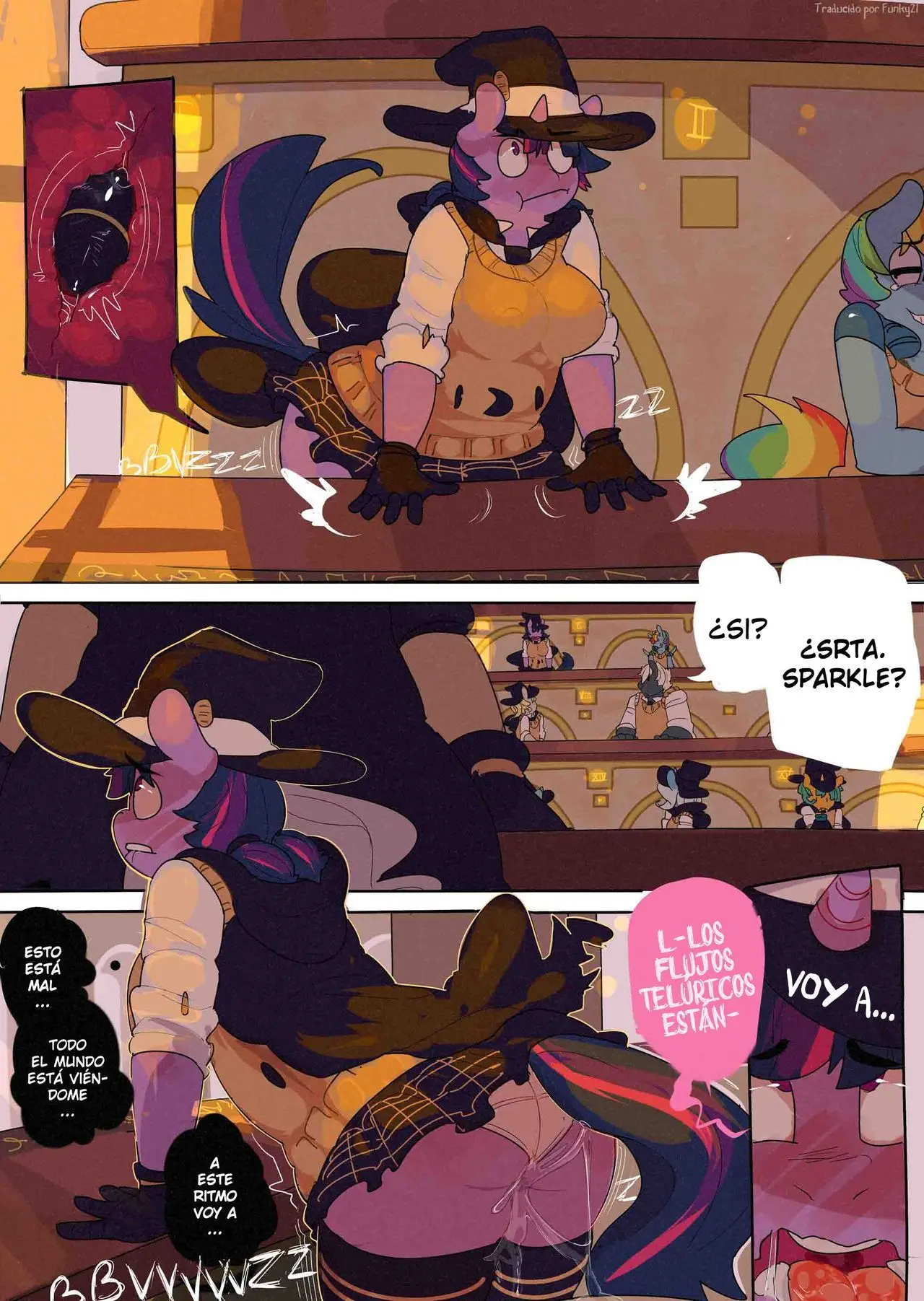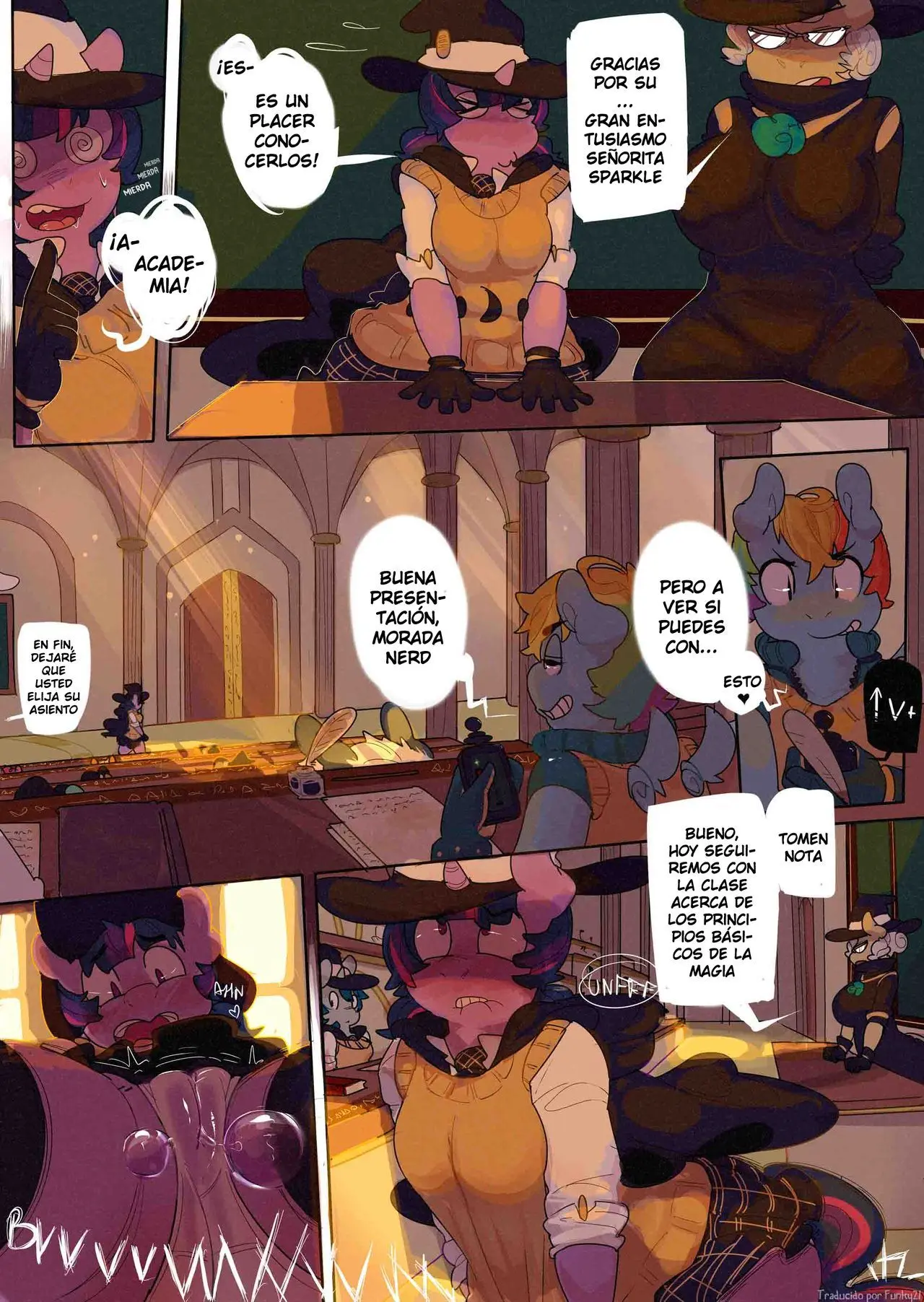 Una vez en la clase, Twilight se presenta ante todos y entre los alumnos está Rainbow, quien prende el control del consolador haciendo quererla poner incómoda. Twilight intenta caminar apretando su coño para que nadie note lo que está pasando y logra sentarse a un lado de Reinbow. Y mientras la profesora está explicando las diferentes clases de ponies y sus poderes, Rainbow continúa usando el control para molestar a Twilight, pero esta si sabe usar su poder, por lo que saca el consolador de su coño y lo mete dentro del de Rainbow. Haciéndola poner muy incómoda.
