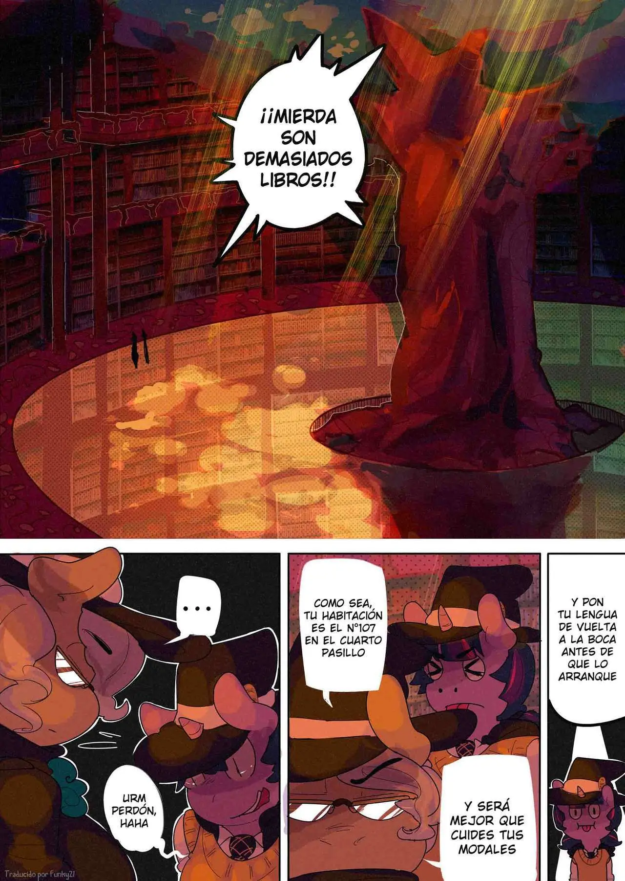 En ese mismo momento la celadora está por los pasillos buscando a la nueva alumna, pero gracias a la cerradura mágica, Twilight es avisada y llega a poner su ropa interior antes de que se abra la puerta de la habitación. Las clases están por comenzar en 5 min, y a Twilight le ha quedado el consolador dentro.
