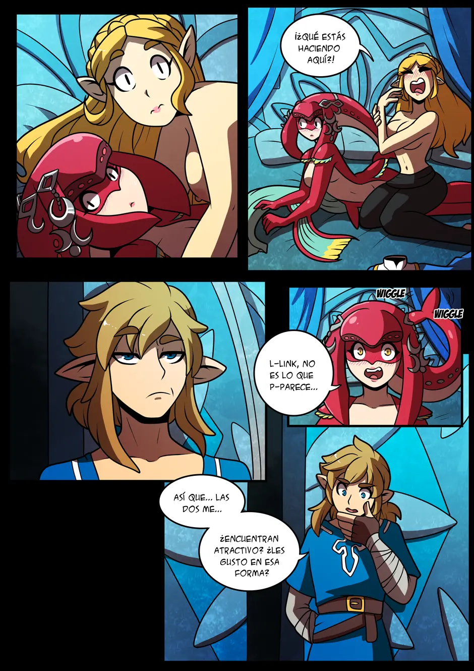 Pero están siendo observadas por Link, que escuchó a Zelda decir que lo encuentra atractivo cuando Mipha gritó su nombre tras asustarse. Dejando sorprendida a Zelda, que es lo máximo que le ha escuchado hablar alguna vez.