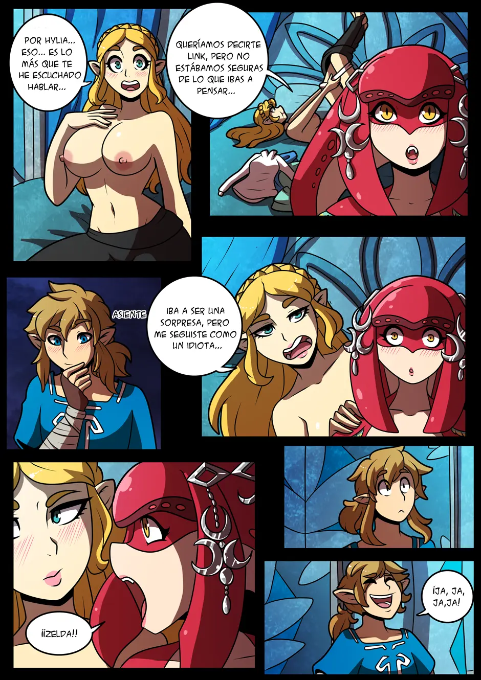 Querían contárselo, pero no estaban seguras de lo que iba a pensar. Sería una sorpresa, pero la siguió a Zelda y ahora los planes se han aguado. A menos que Link quiera unírseles para un trío. Lo cual el muchacho hace, besando las bocas de ambas princesas.