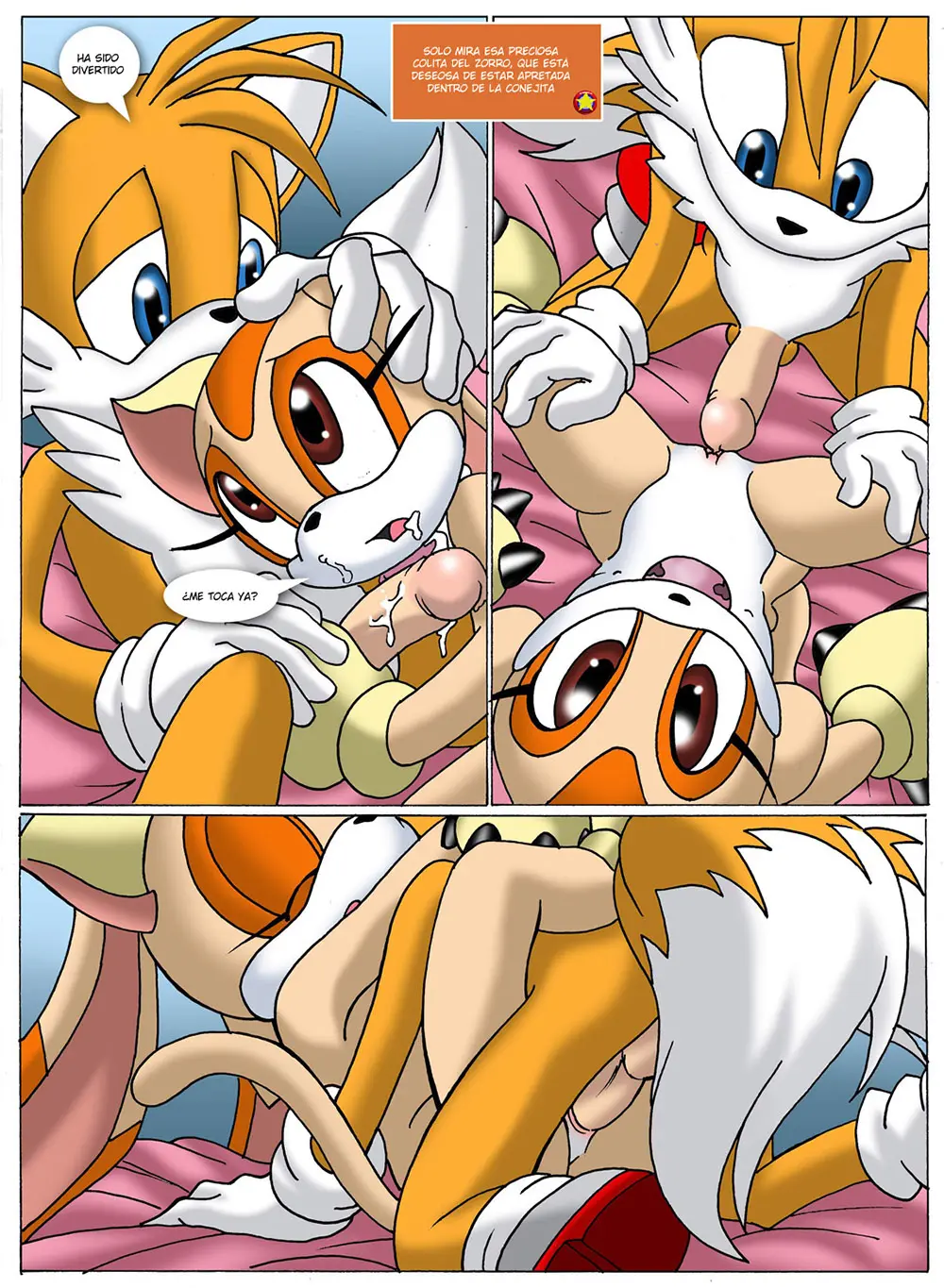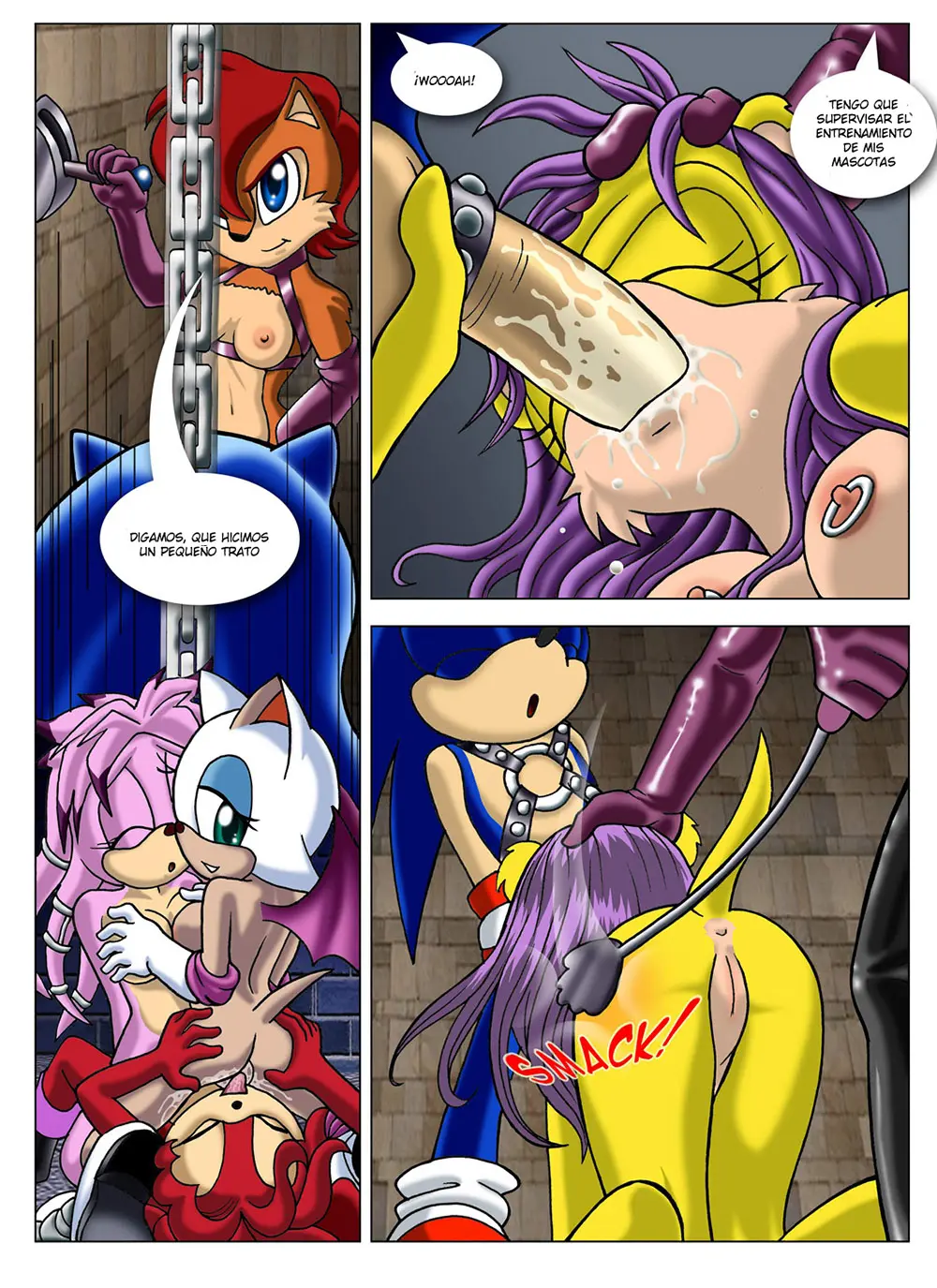 Volviendo a Sally, esta está obligando a su mascota Mina que le chupe el coño a Sonic. Este ya se ha dejado de retorcer y está sintiendo un inmenso placer; Sally también quiere ser parte de estos dos y no solo mirar, por lo que se mete tres de sus dedos en la boca y, luego de mojarlos bien, los introduce en el coño de Mina. Esto la enciende aún más a Mina, que toma la polla que tiene en la boca con ambas manos y succiona con más fuerza.