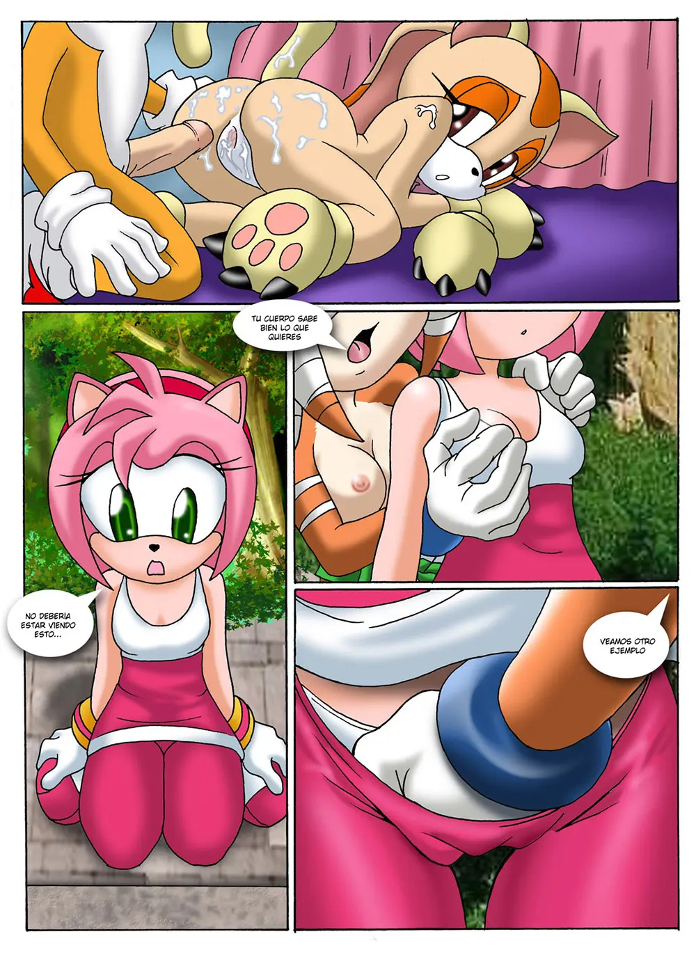 Amy está muerta de miedo y le cuesta entender cómo en un templo sagrado se puede estar teniendo sexo, pero Tikal le muestra en el reflejo del estanque cómo todos tienen sexo. Primero ve a Cream, que está en cuatro, mostrándole el coño a Tails y pidiéndole que entre en ella. Luego ve cómo Cream le chupa el pene a Tails hasta hacerlo terminar. Después de esto, Tails se mete con su pene empujando dentro de Cream; luego hacen un 69. Amy pregunta qué es lo que están haciendo, a lo que Tikal le explica que se están explorando uno a otro. Amy siente que no debería estar viendo esto. Pero para este momento Tikal ya la tiene agarrada de los pechos y con su otra mano se está metiendo en el coño de Amy.