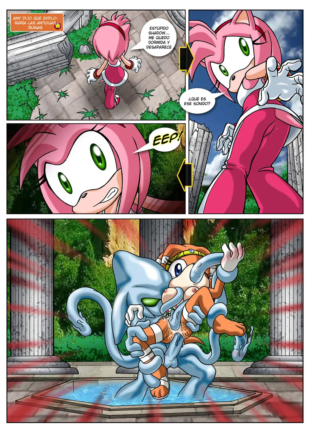 Mientras tanto, Amy estaba explorando las antiguas ruinas, ya que se quedó dormida mientras estaba con Shadow y este desapareció. Tikal no estaba muy lejos de ahí; estaba dentro del templo teniendo algo de entretenimiento con Chaos, quien la tiene agarrada por cada parte de su cuerpo: la sostiene en el aire con sus manos, tiene su pene en el ano y con sus tentáculos se ha enrollado en su cuerpo, tomándola por las piernas y metiéndose con uno de ellos en su coño y con otro enroscado en sus pechos, se le ha metido en la boca. Aunque a primera vista pareciera que Tikal estaba luchando y que estuviera en grandes problemas, la verdad es que lo estaba disfrutando. Cuando ambos sienten la presencia de Amy, que ha llegado al templo, la invitan a que se una a ellos.