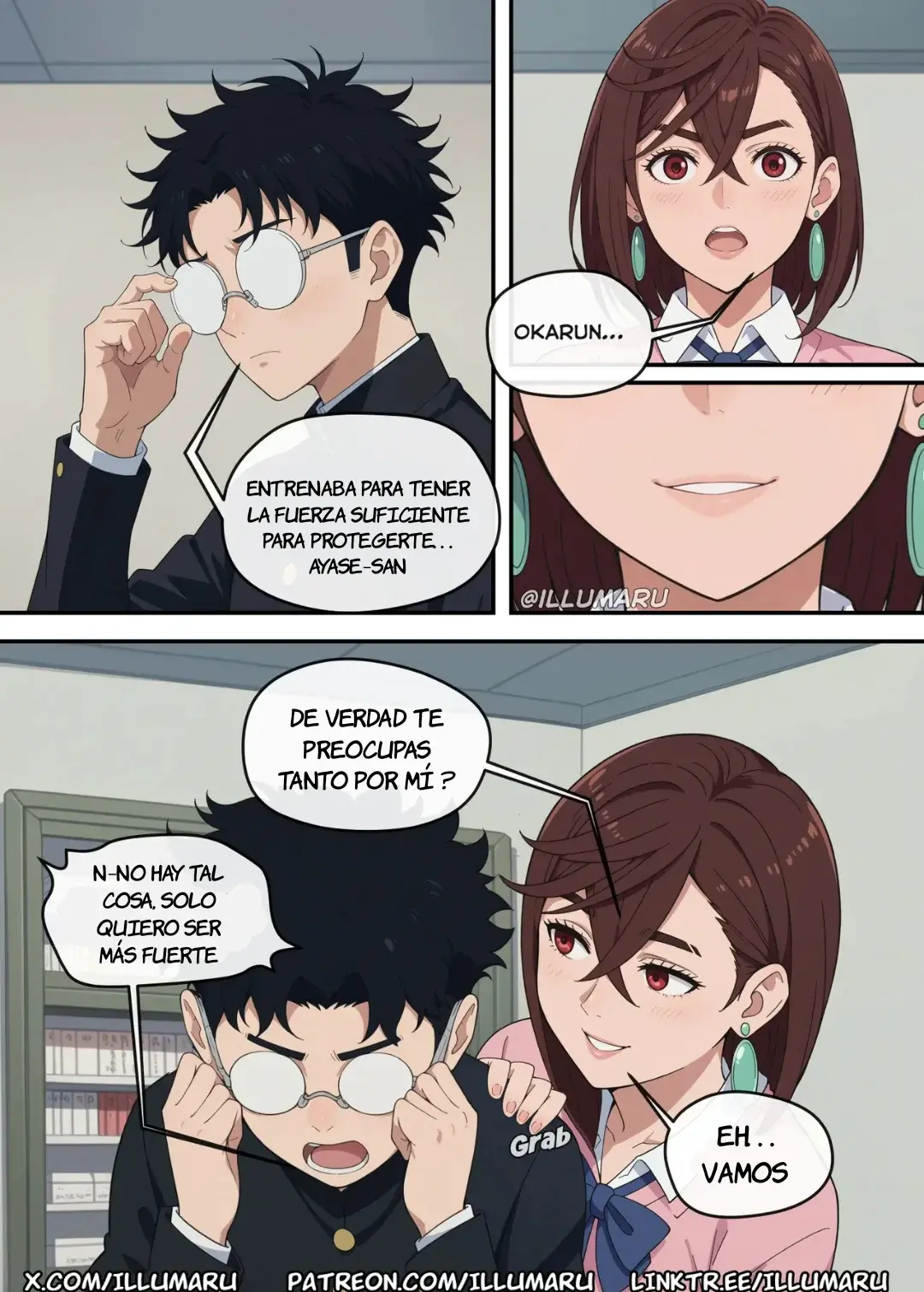 Entonces comienza a hacerlo desde el principio. Él mentía cuando decía que estaba ocupado escribiendo un informe. En realidad, estaba haciendo ejercicio para volverse más fuerte. Eso hasta que Aira llegó e intento besarlo, lo que provoco que ambos tropezaran y cayeran al suelo. Más precisamente él sobre ella, lo que parecía como si él estuviera besándolo, o algo peor. Ese fue el momento justo cuando Momo los vio. Una respuesta que verdaderamente impresiona a la chica, porque Okarun le explica que quería ser más fuerte para protegerla.