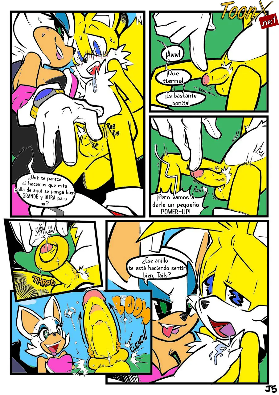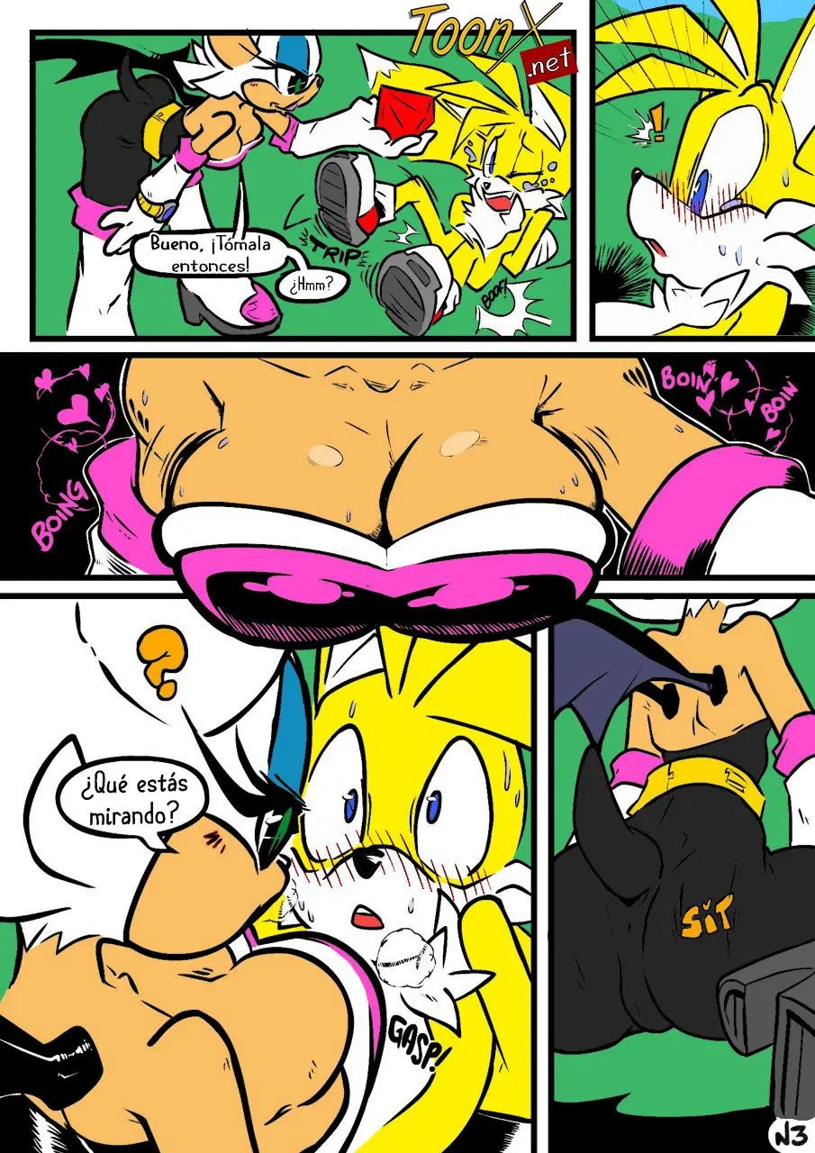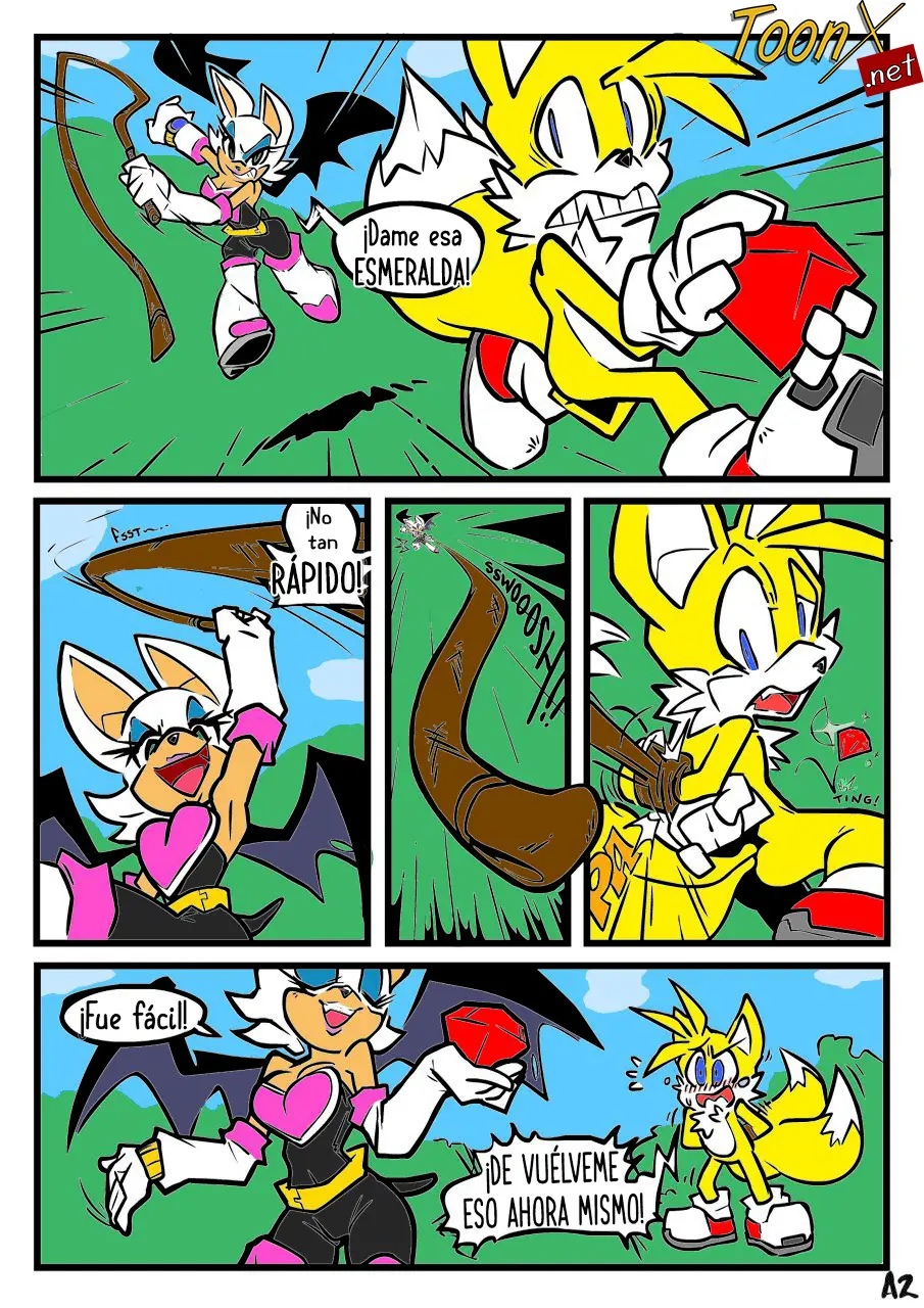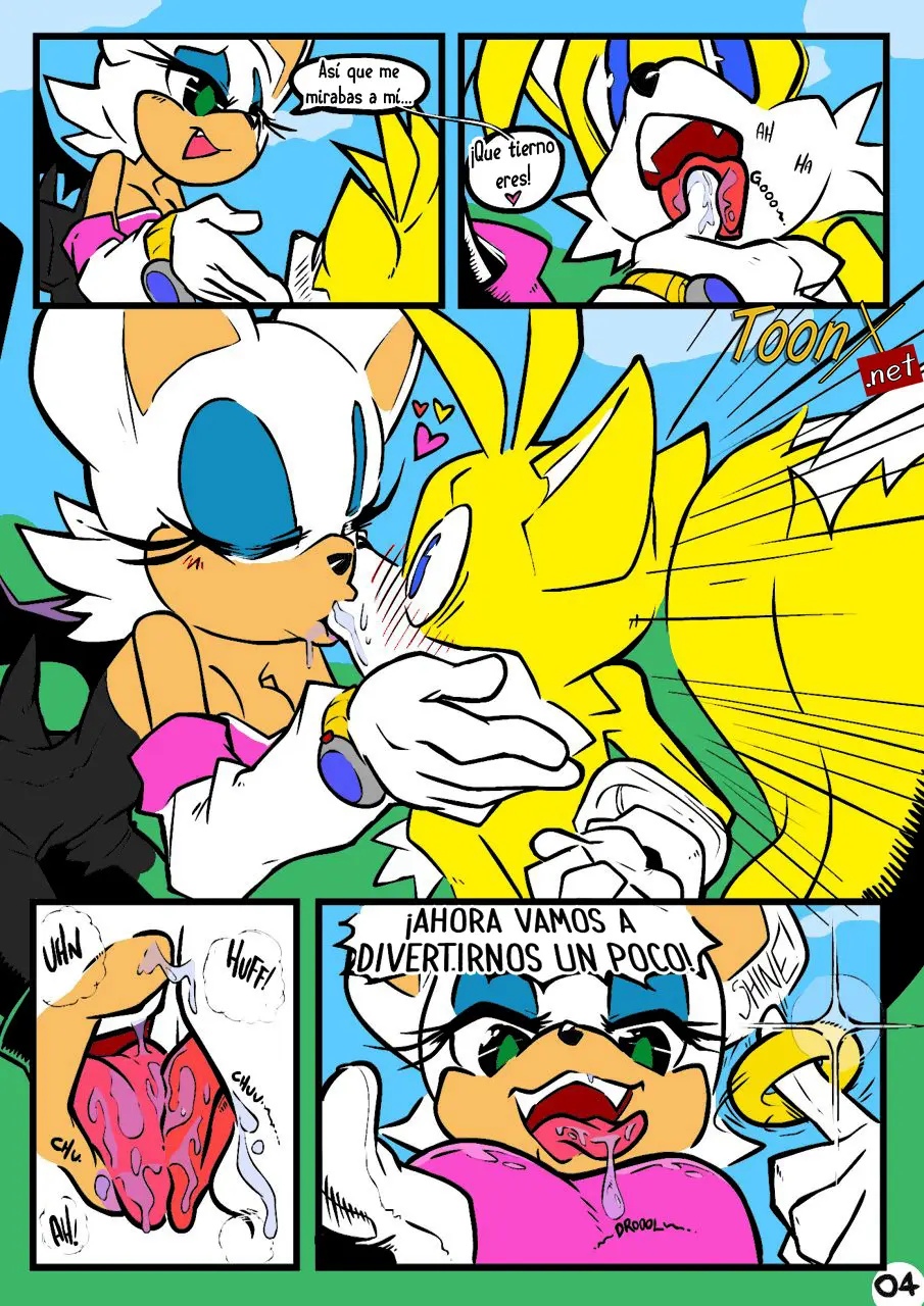 Rouge se da cuenta de la manera en que Tails la está mirando, esa mirada de deseo, y como le parece algo tan tierno, le da un beso muy mojado en la boca. Pero antes de irse con la esmeralda, quiere divertirse un poco.