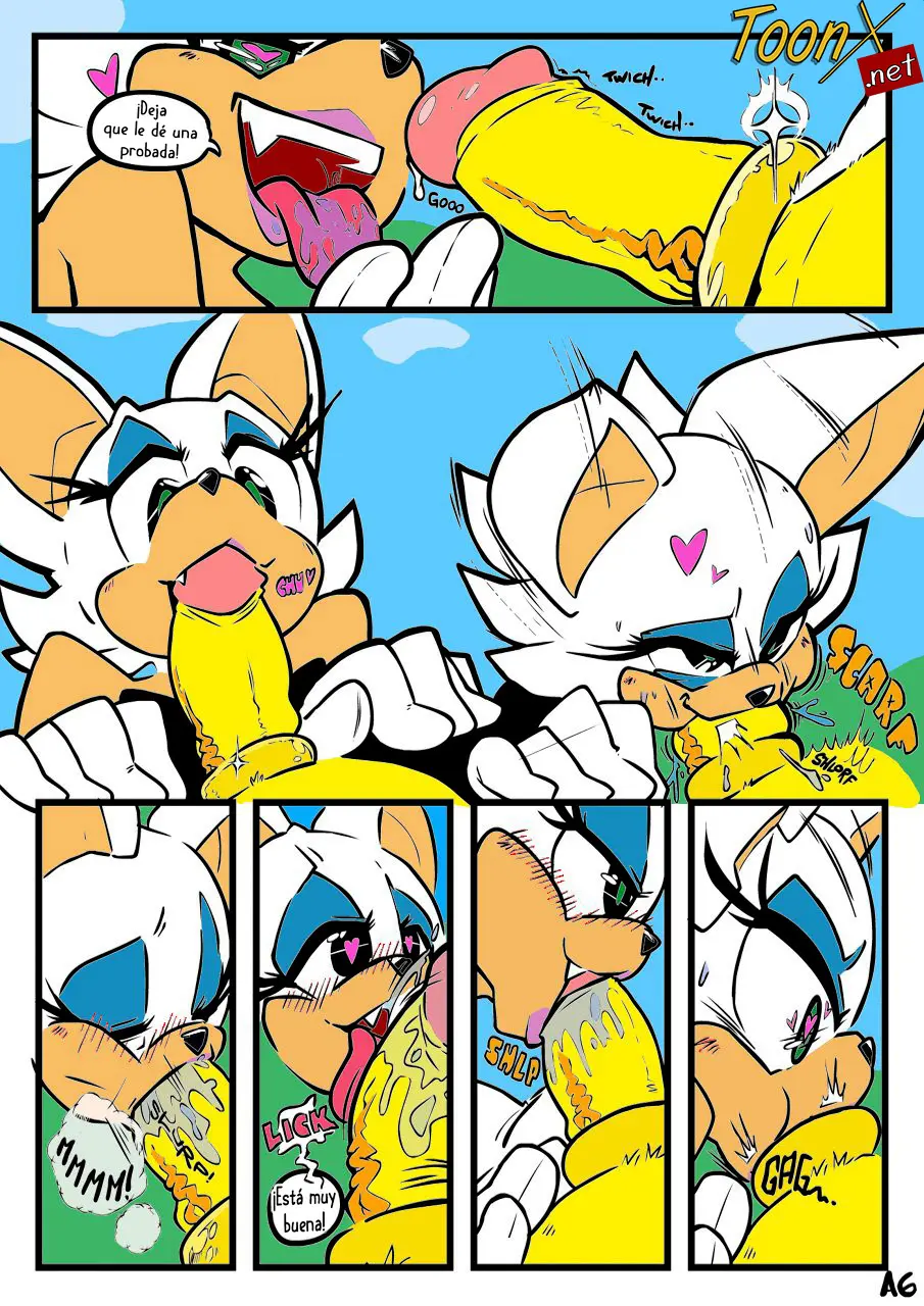 Rouge quiere darle una probadita. Y se lo mete por completo en la boca hasta tocar con sus labios el anillo. Está tan buena y sabe tan bien qué casi que se podría enamorar de esta polla. Tails se está enloqueciendo con esta chupeteada y termina muy rápido. Su corrida es sumamente deliciosa.