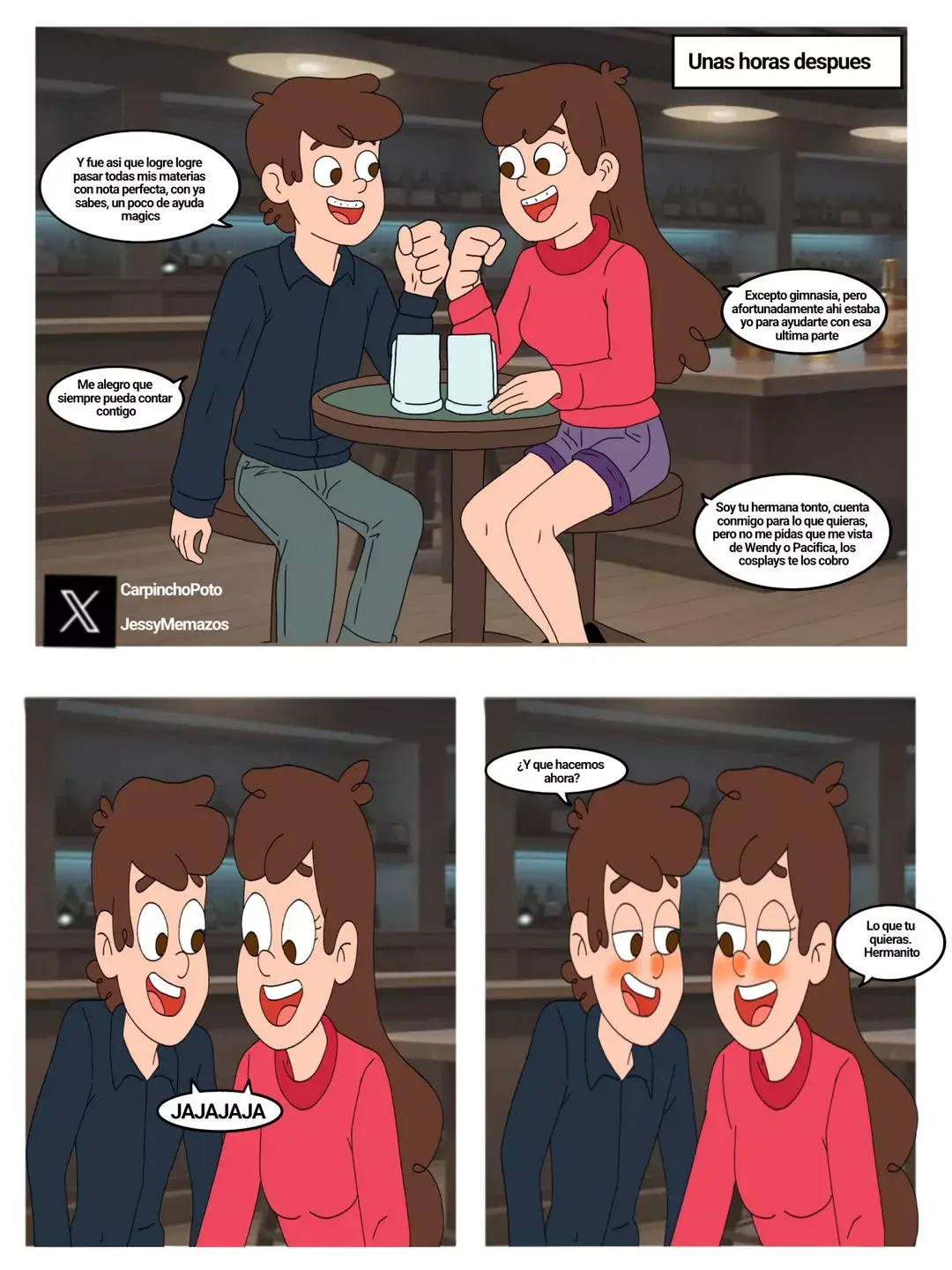 Una hora después de tanta charla, se han puesto al día con las cosas que les han pasado en los últimos años, Dipper ha comentado que ha hecho trampa usando magia para aprobar. Y Mabel siempre lo ha ayudado. Y siempre lo ayudará, solo no quiere cumplirle sus deseos de cuando le pide que se haga pasar por Wendy o Pacifica.