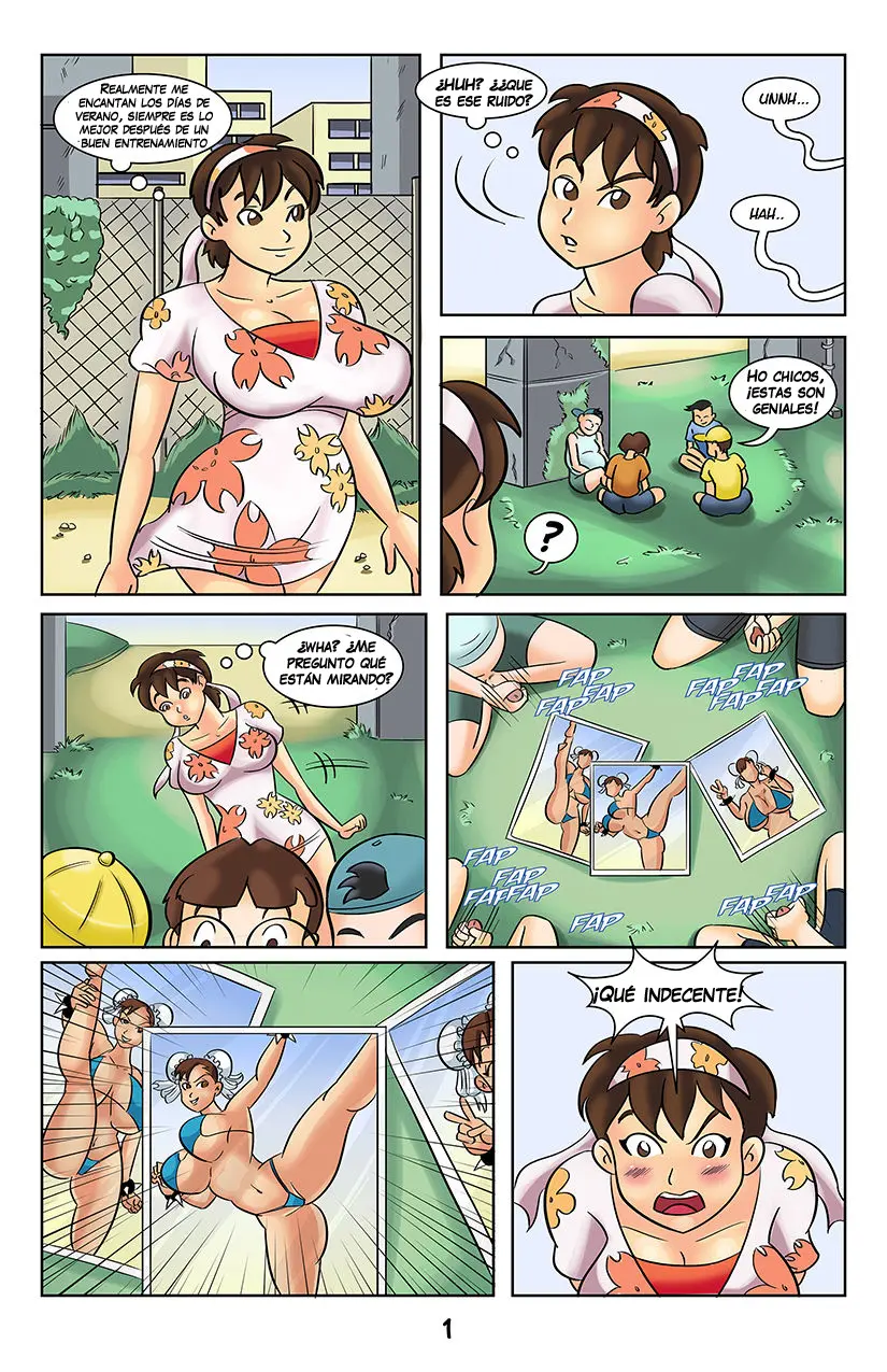 Sakura ama los días de verano, porque es lo mejor después de un buen entrenamiento. Pero su paseo en un vestido floral es interrumpido cuando escucha a un grupo de chicos jugando. O al menos eso es lo que piensa, porque cuando se acercan, en realidad se están masturbando con unas fotos. Son las de Chun-Li en traje de baño, lo que para Sakura es algo muy indecente.