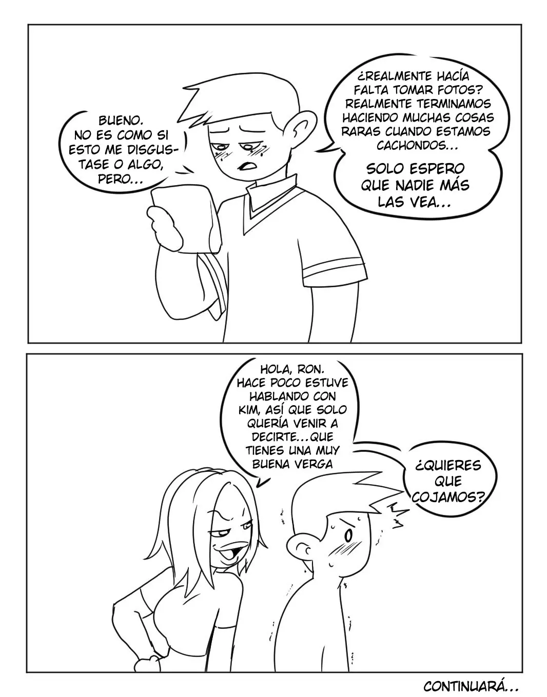 Shego le pregunta a Kim, como si fuera su mejor amiga, si no le importa ser la primera en estar con él. Ron murmura como pensando que tiene algo que decir en este trío, pero Kim le dice que no interrumpa que ellas están hablando. Para Kim sería lo justo, porque la última vez que hicieron esto ella estuvo más tiempo con Ron que Shego. Así que le dice que lo haga y que se dé el gusto de disfrutar la polla tanto como quiera.