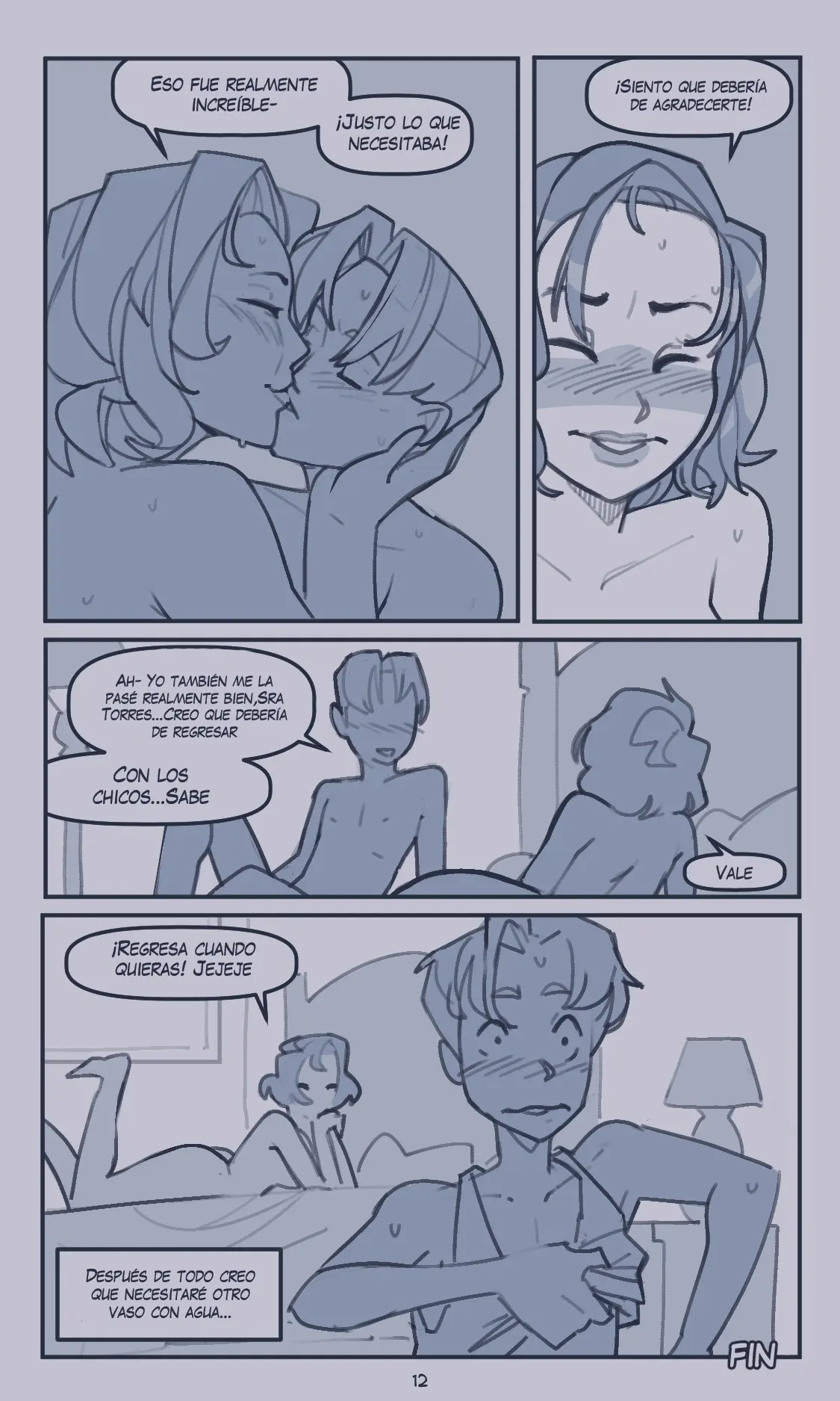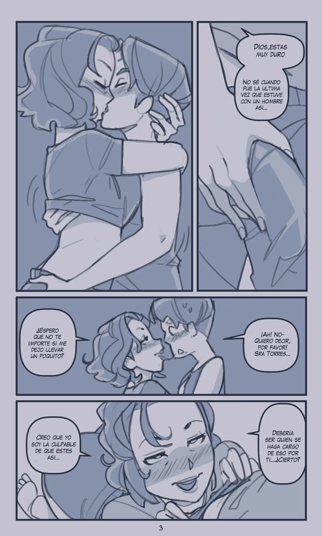 La Sra. Torres sabe que ella es la culpable de esta hinchazón, así que se hará cargo descendiendo hasta ella para liberarla. Llevándose una grata sorpresa cuando la polla del muchacho la golpea en la nariz. Y a pesar de que ella no ha tenido sexo en mucho tiempo, no se ha olvidado como mamarla.