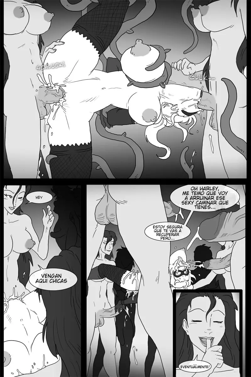 Así que tiene una idea y espera que su amiga Harley no se desmaye, todavía queda una noche larga por delante. Multiplicándose en tres Hiedras Venenosas para hacerlo con Harley con tres pollas a la vez. Por eso le pregunta cuáles son sus últimas palabras. A lo que Harley responde con que hay peores formas de irse.
