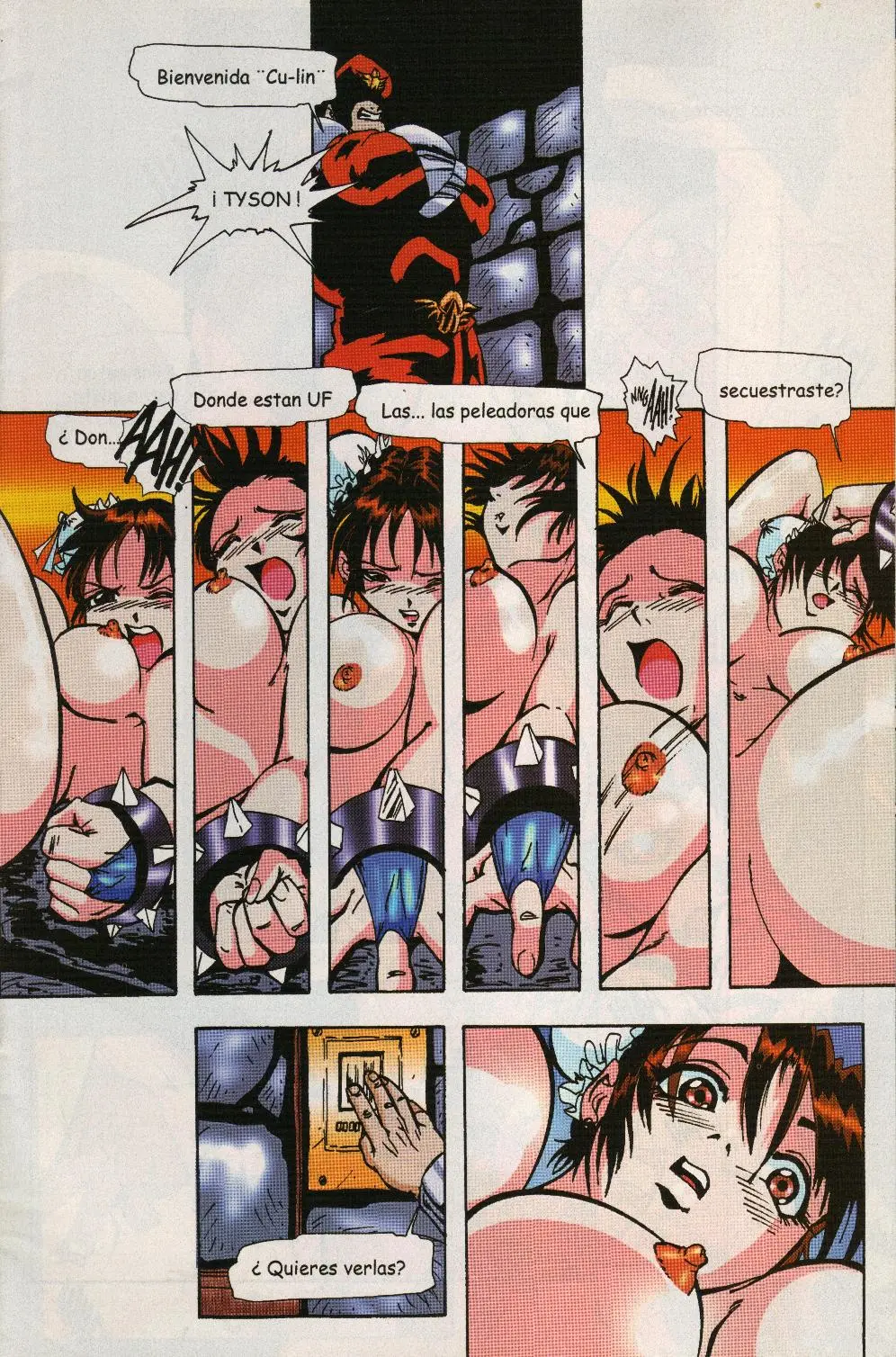 Vega le dice a Chun-Li que se rinda, pero esta no lo hará aunque lleve toda su ropa desgarrada. Para el hombre, eso es muy tierno de parte de Cu-Lin, pero se ha cansado de ese juego y lanza un ataque demoledor que la deja toda desnuda. Ahora Vega le mostrará de qué es la V de su nombre. La cual proviene de verga, que es lo que usará para follar el coño peludito de esta luchadora.