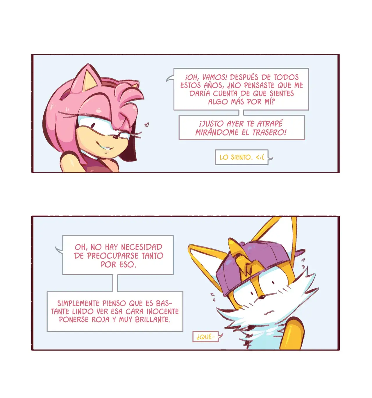 Tails, muy avergonzado, pide disculpas. Pero Amy lo calma diciéndole que no hay necesidad de que se preocupe por ello; simplemente piensa que es bastante lindo ver su rostro tan inocente ponerse rojo y tan brillante.