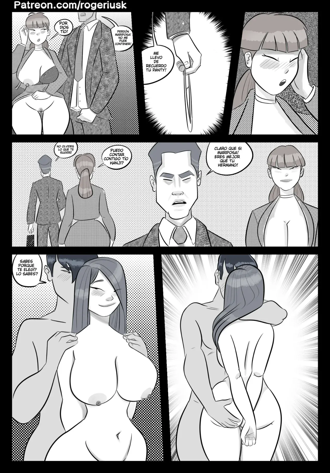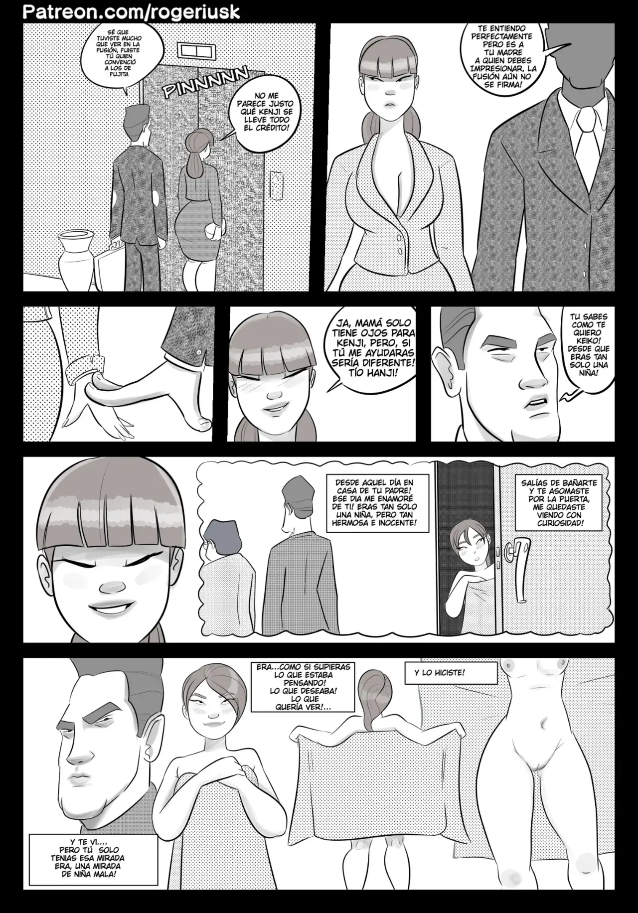Mientras tanto, la hermana de él se sube al elevador junto a su tío. Ella no está de acuerdo con la fusión, pero sabe que la madre solo escucha a su hermano. Eso le trae recuerdos a los dos, de cuando ella era más joven y le mostró al tío lo que había debajo de su toalla. Lo que lleva al tío a detener el elevador y comerle el culo a la sobrina.