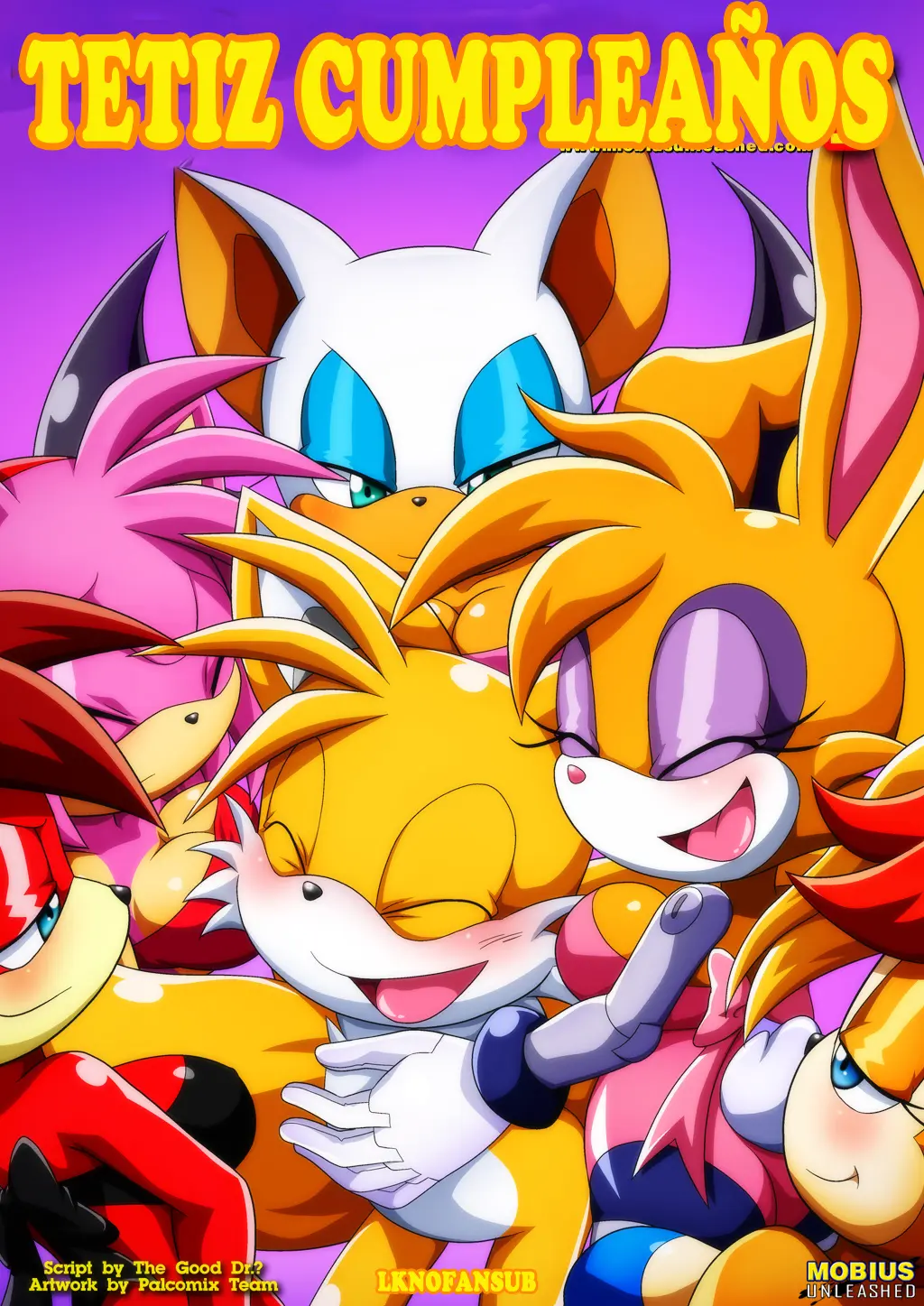 Y las invitadas siguen llegando: Li Moon, Julie Su, Mina. Mientras Amy es la primera en poner el pene de Tails entre sus pechos. Y no solo en sus pechos, sino que también lo ayuda con la boca a correrse. Con esto Amy se ha puesto tan caliente que se le ve el coño muy mojado.