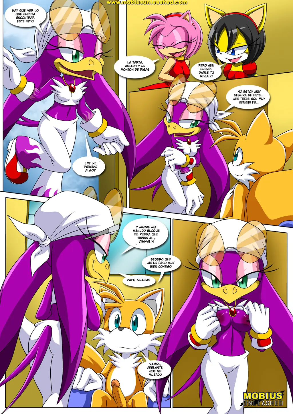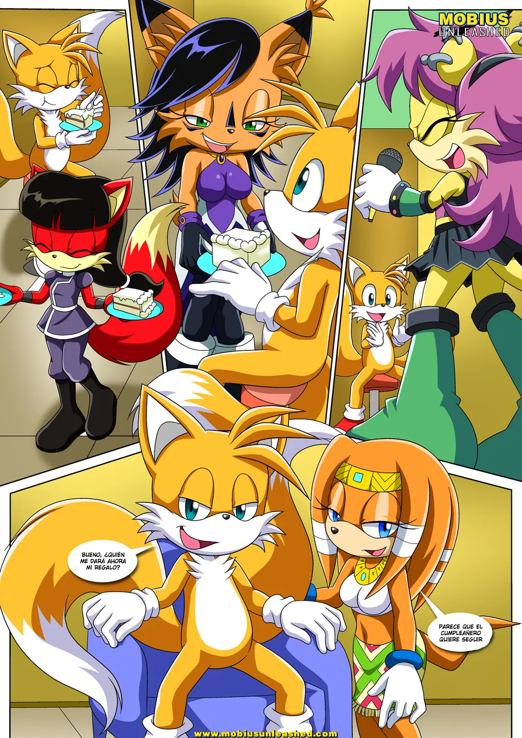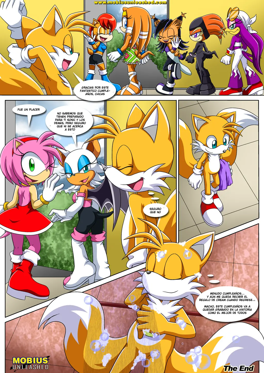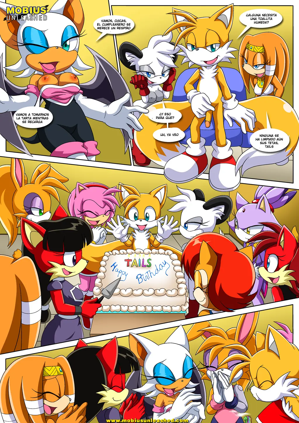 Rouge y Sally llegan con helado para todos. Y todas disfrutan de dos bolas deliciosas. Luego de esto, es Rouge quien quiere agasajar al cumpleañero y, completamente desnuda, se arrodilla ante él y mete ese pene entre sus dos grandes tetas. Tails sorprende dándole una gran cantidad de semen en su boca. Ahora es el turno de Sally, luego de Shade, quien parece notar que Tails está muy, muy caliente porque Cream ha estado haciendo que se contenga durante dos meses. Por último, Tikal y luego Wave le dan el regalo al cumpleañero.