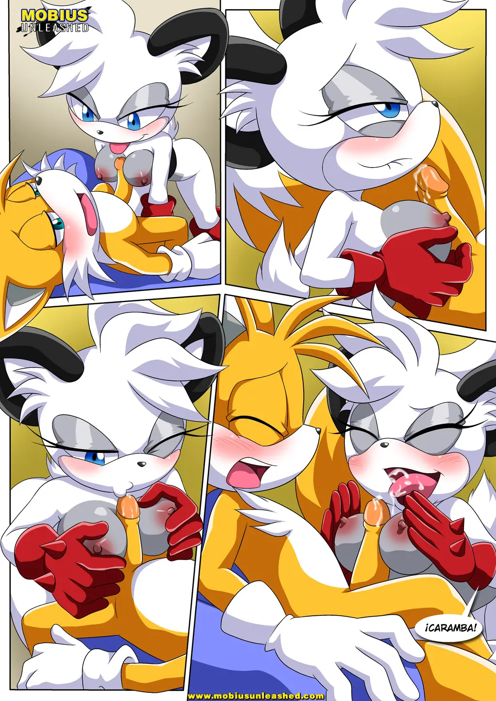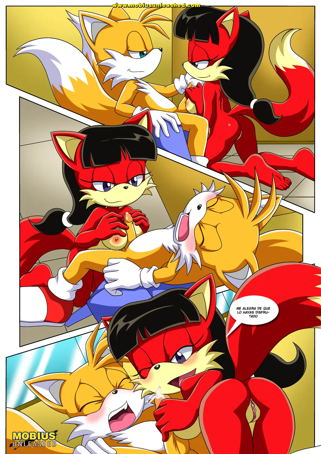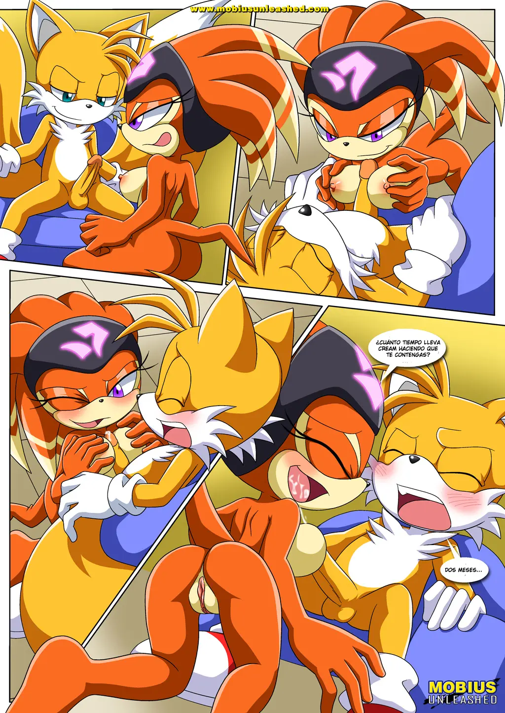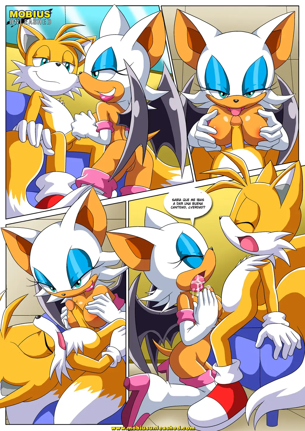 Ahora es Bunnie quien se acerca y se arrodilla entre las piernas de Tails. Parece que este cumple es un cumple de tetas, porque esta también se mete el pene de Tails entre sus pechos, haciéndolo gemir mucho. Luego es el turno de Fiona, quien, al haber visto a todas las anteriores, se sube sobre él, ya no aguantando las ganas y también lo hace correrse. Es increíble que Tails tuviera para tanto.