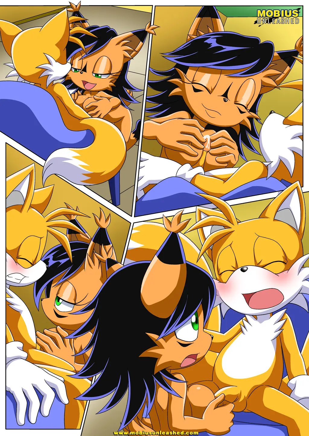 Tails se ha recuperado y se vuelve a sentar en el sofá, ya que quiere seguir recibiendo sus regalos. Honey salta sobre él, queriéndole dar placer con sus pechos y llevándolo a correrse en su boca.