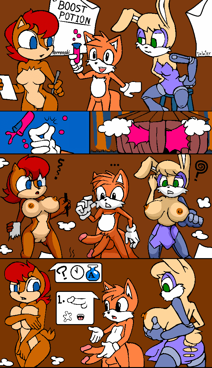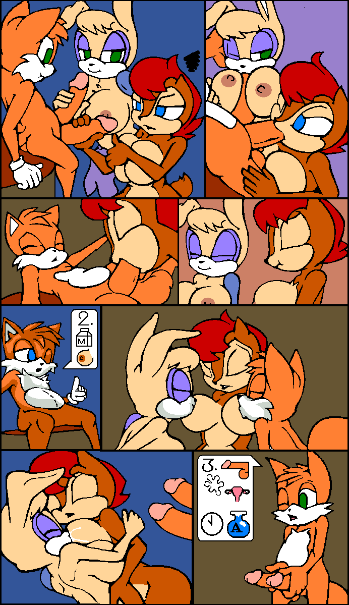 A Tails se le ha ocurrido hacer una poción, pero no ha manipulado bien la fórmula, ya que ha hecho explotar todo. Pero estas no han sido las únicas consecuencias. A Tails le han crecido dos pollas muy largas; a Sally le han crecido los pechos y un coño muy abultado, y a Bunnie también le han crecido mucho los pechos, haciendo que su body se desprenda.