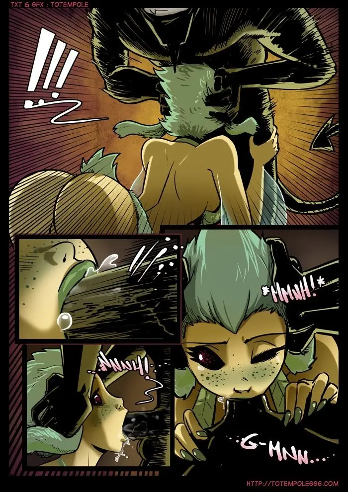 Aldona interrumpe queriendo unirse a la acción, mientras Tuck está con su lengua dentro del Hada. Aldona se sienta en la boca de su amiga haciendo que le chupe el coño. Luego Tuck mete su gruesa polla en ella, haciéndola gritar. Tuck con su cola toma del cuello a Aldona, acercándola a su boca y metiéndole la lengua dentro. Aldona reconoce el sabor en la boca de Tuck, hay algo en su saliva, un afrodisiaco.