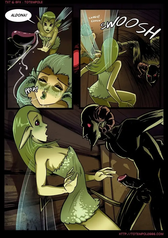 Aldona le admite a su amiga que Tuck es algo lindo y de un tamaño muy apropiado. Y tocando la polla de Tuck le confiesa a su amiga de que está cansada de hacerlo con lobos, porque siente que son demasiado bruscos y te parten al medio. Su amiga se enoja preguntándole que ha hecho con Tuck que no reacciona. Aldona lo ha hipnotizado, ya que no quería tomar riesgos. Pero algo sale demasiado mal, Tuck se vuelve completamente agresivo, como si no fuese el mismo. Tuck agarra la cabeza de Aldona y la obliga bruscamente a que le chupe la polla. Su amiga vuela a ayudarla. Y cuando Tuck está encima de ella pareciendo que quiere lastimarla, Aldona usa su magia. Pero no puede contenerlo. Tuck desgarra las ropas de esta Hada, tomándola de las muñecas. Aldona le pide a su amiga que huya, pero su amiga le pide que lo libere de la magia. Tuck la toma con desenfreno y oscuridad, lamiendo sus pechos, apretando su trasero. Luego la tira con fuerza al suelo, donde nuevamente se tira sobre ella, y abre sus piernas.