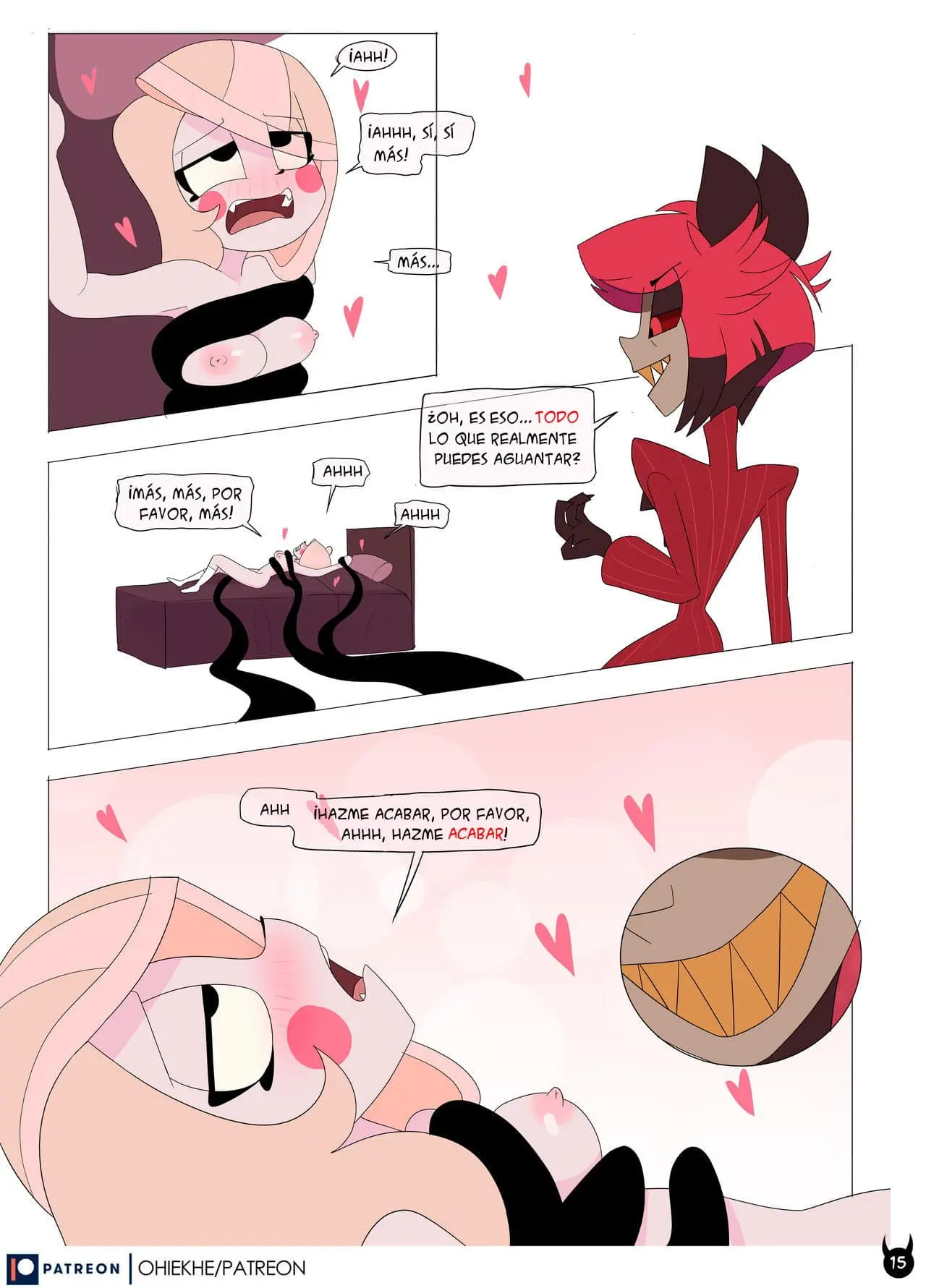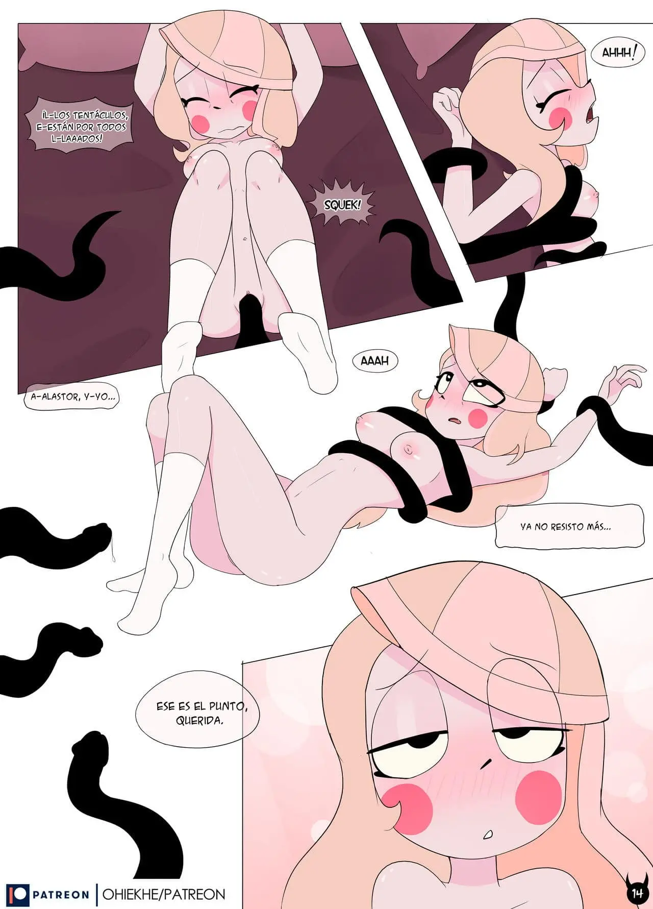 Alastor le dice que no se resista y deja salir sus tentáculos que desvisten a Charlie, la ponen en la cama y la dejan abierta de piernas para que Alastor pueda pasar su dedo por allí. Los tentáculos de Alastor están por todas partes; Charlie ya no puede resistirse al placer, está a punto de un gran orgasmo. Ya ha llegado al momento donde no se resiste e incluso pide más. Charlie comienza a gritar que la haga terminar, pero este es el momento oportuno para Alastor de retirarse.