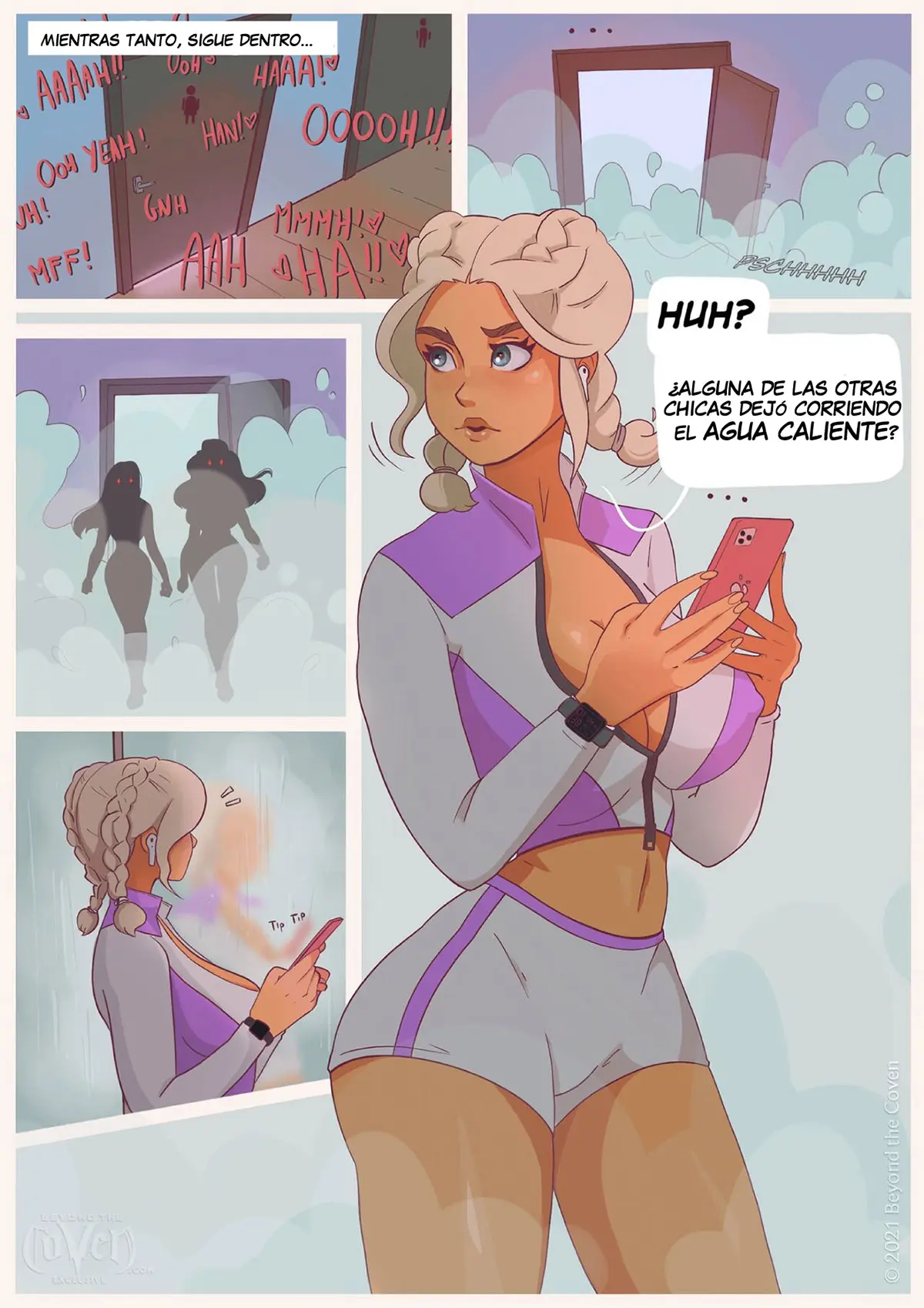 Cuando nuestra protagonista ha terminado con su sesión y va a usar los baños, se da cuenta de que la puerta está bloqueada. Su amiga Lia nunca lo había hecho antes, hasta que comienza a escuchar los gemidos que vienen de ahí dentro. Por eso ella decide no arruinarle la diversión y duchar en casa esta noche.