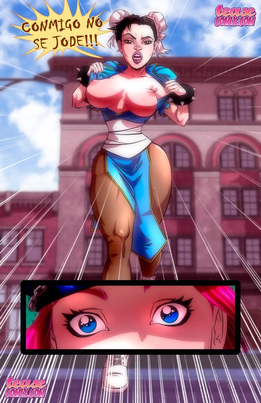 La pelea se ha convertido en un show y algunos hombres comienzan a acercarse. Todo mientras Chun-Li ha pateado la cara de su contrincante para hacerle un paizuri cuando está en el suelo. Ahora la que se burla es ella, que tiene dominada a la villana con sus grandes pechos.