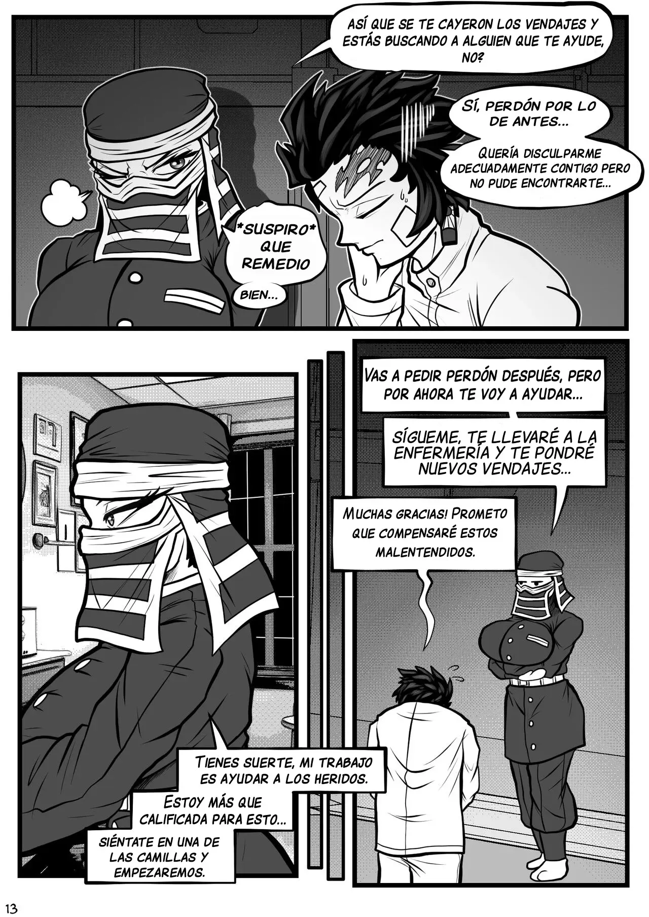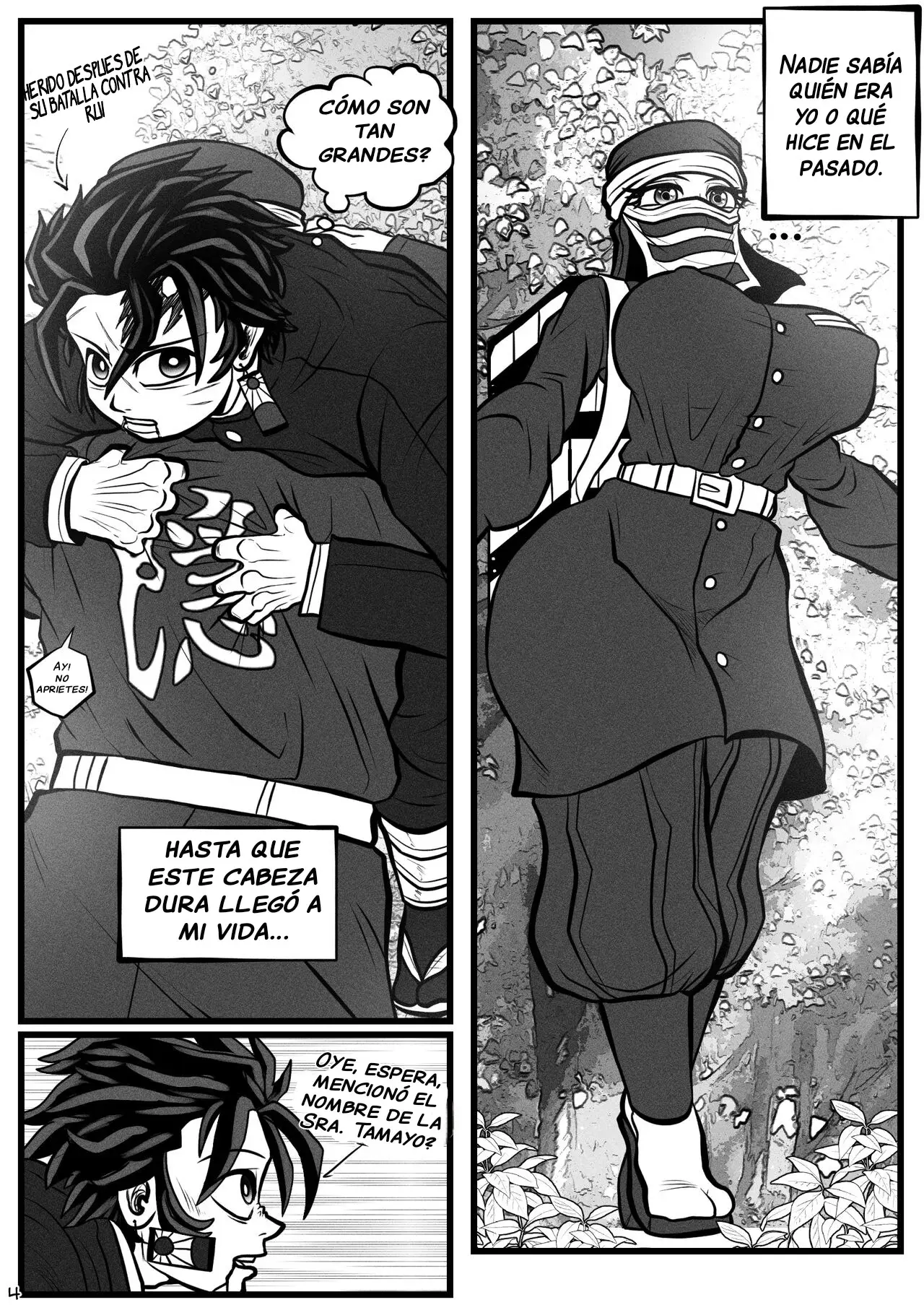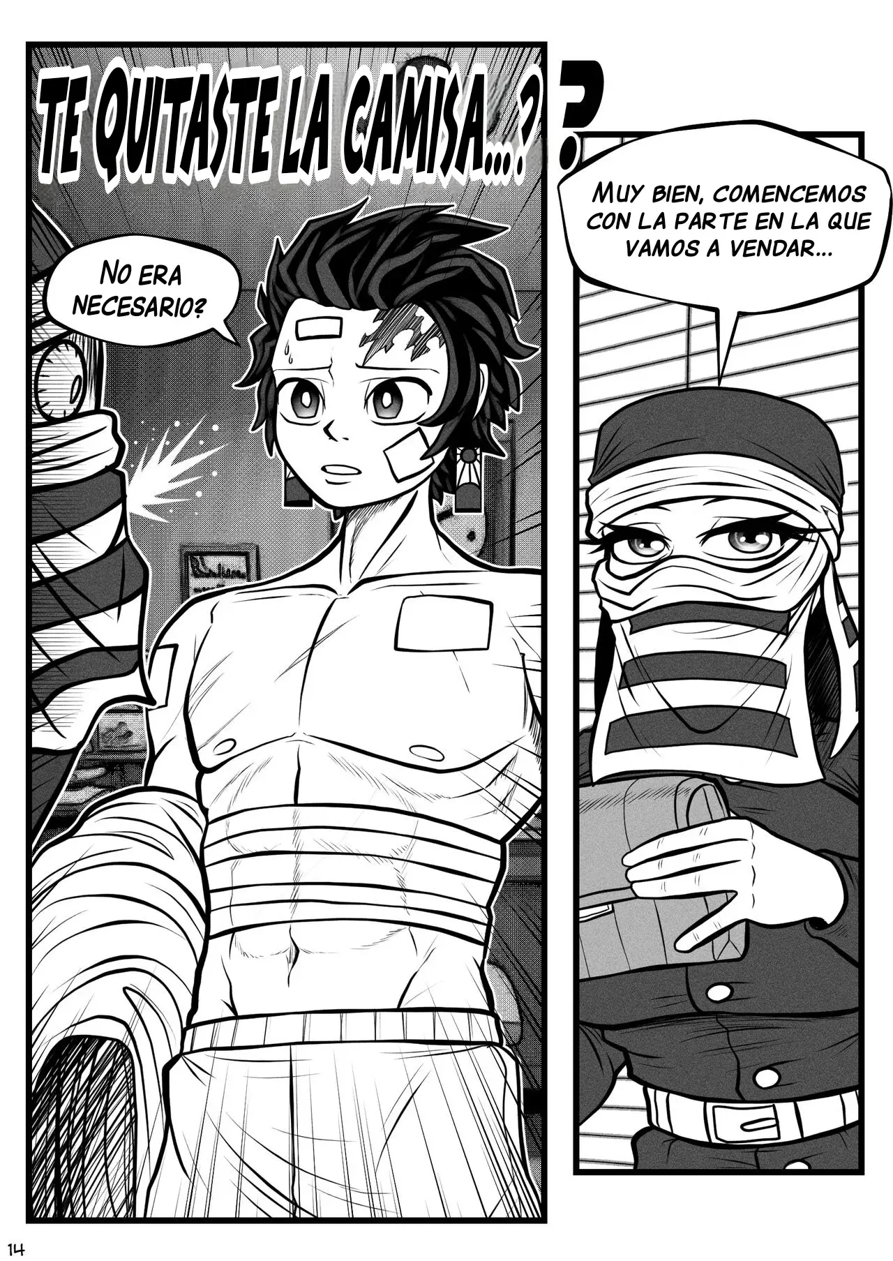 En la enfermería, la kakushi comienza a ponerle vendas en su cuerpo. Hasta que nota los arañazos en la espalda de Tanjiro y le pregunta cómo se los ha hecho. A lo que el chico le dice que es algo muy vergonzoso y que no le gusta hablar de eso. Pero la kakushi tampoco puede negar que le ha calentado ver el torso desnudo del chico.