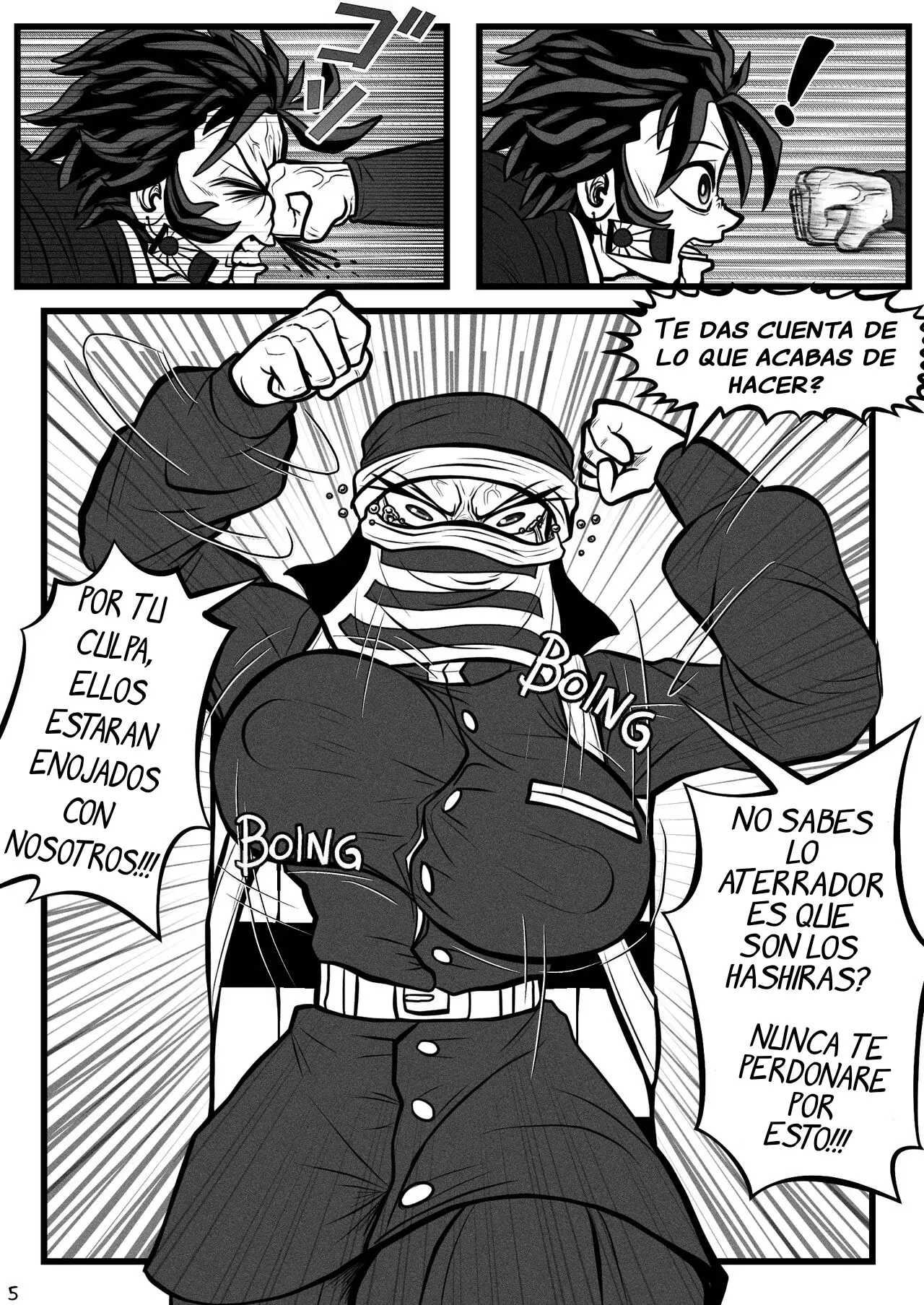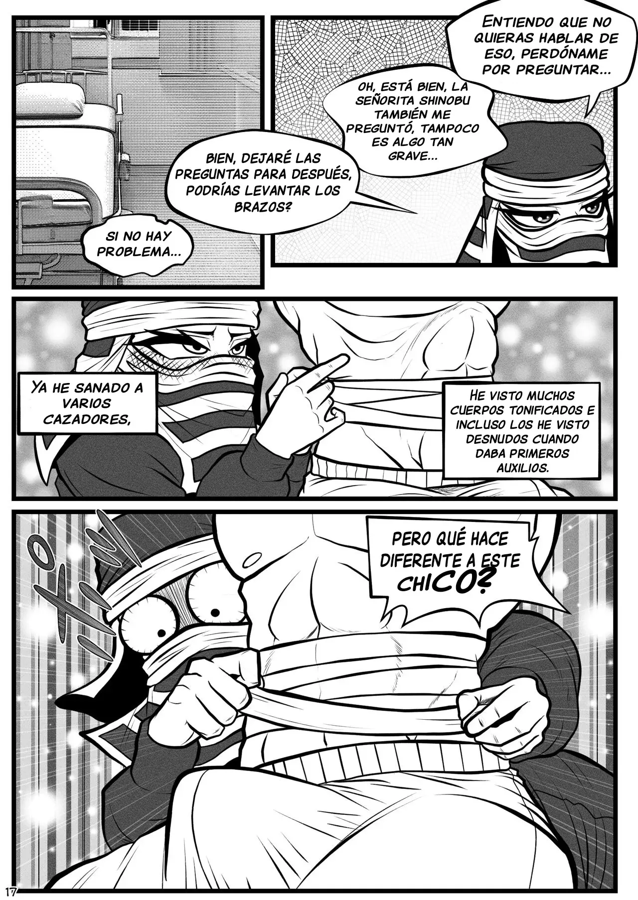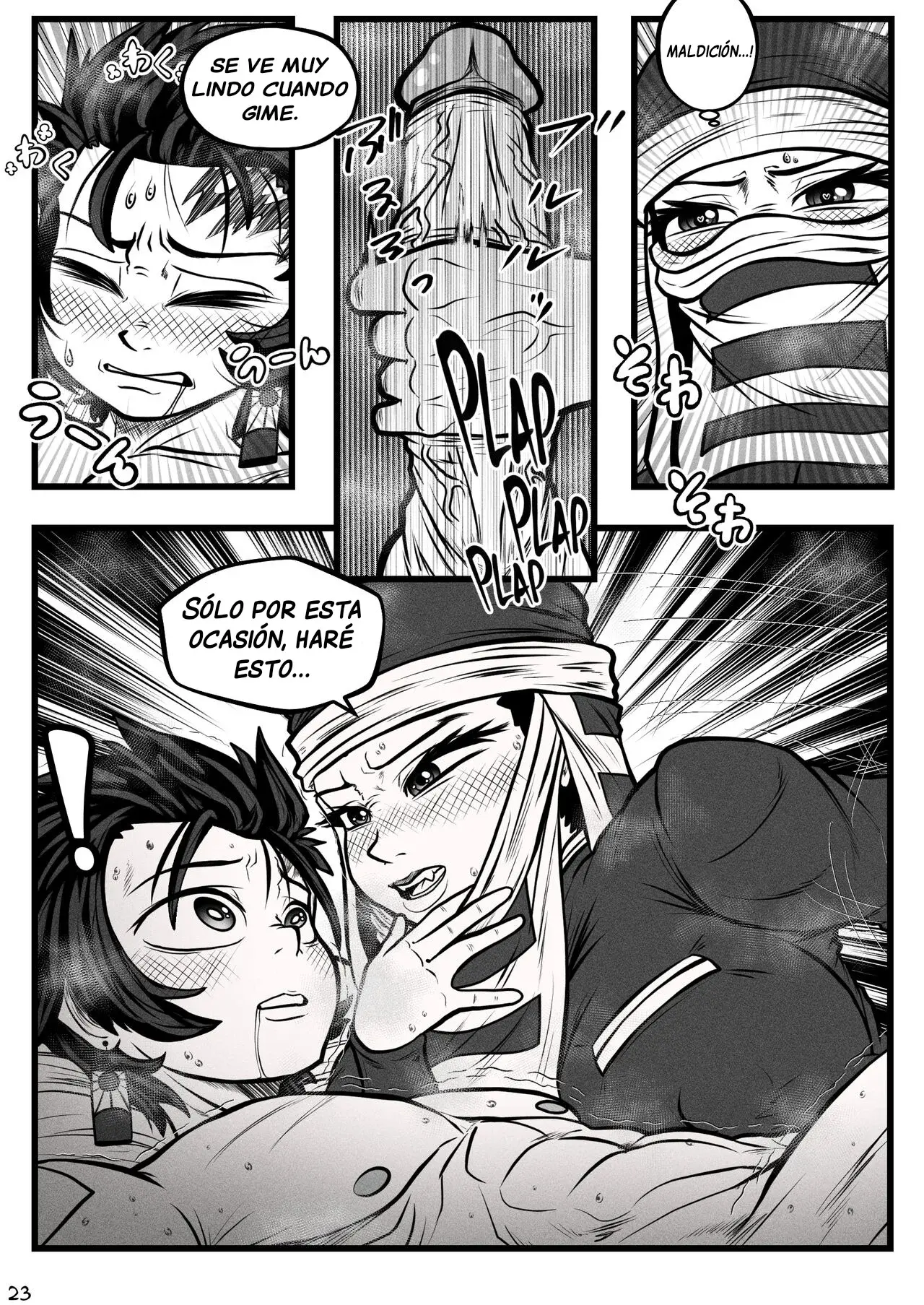 En la enfermería, la kakushi comienza a ponerle vendas en su cuerpo. Hasta que nota los arañazos en la espalda de Tanjiro y le pregunta cómo se los ha hecho. A lo que el chico le dice que es algo muy vergonzoso y que no le gusta hablar de eso. Pero la kakushi tampoco puede negar que le ha calentado ver el torso desnudo del chico.