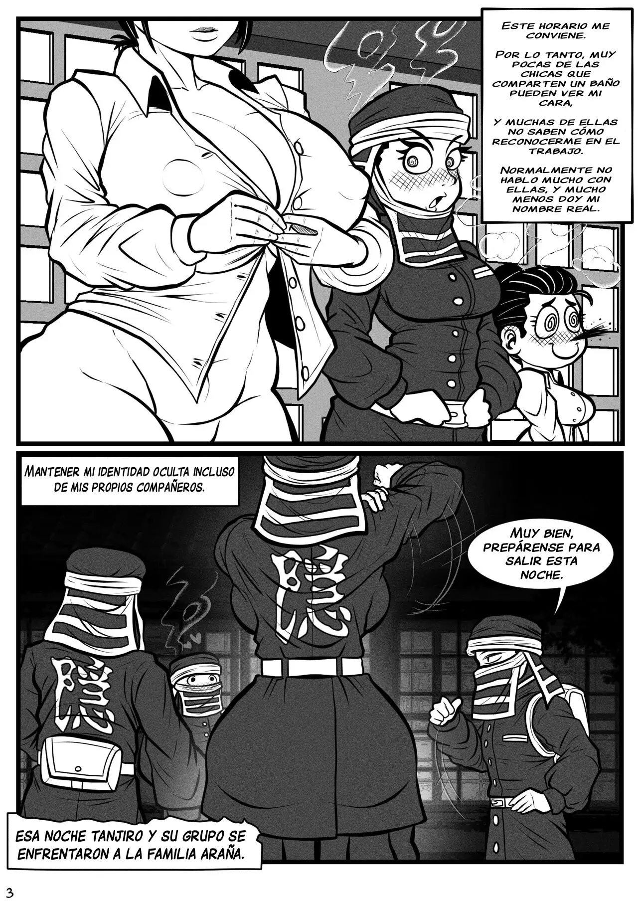 En la madrugada, hay muy pocas chicas kukushis despiertas en la Finca Mariposa. Por suerte queda la más tetona tomando una ducha. Eso es porque no quiere que ningún otro miembro pueda verle su cara. Hasta ese momento, nadie sabía quién era ella ni su pasado. Todo hasta que el cabezadura de Tanjiro llegó a su vida luego de su batalla contra Rui.