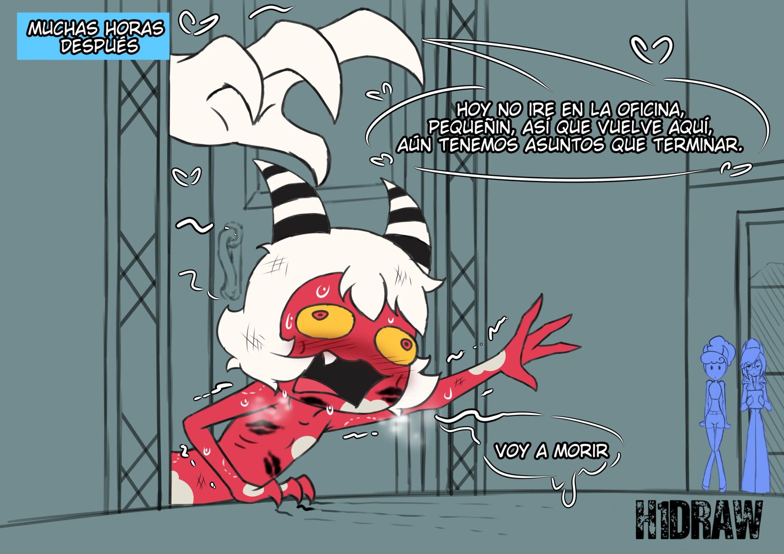 Loona está muy caliente y está en su casa esperando a Moxxie para que la atienda, está tan mojada que no puede esperar, por lo que no se da cuenta cuando abre la puerta que no es Moxxie quien toco, sino un demonio muy parecido a él, un repartidor llamado Larry. En su desesperación Loona lo agarra de la ropa y lo lleva a su habitación pidiéndole que sigan en lo que quedaron la noche anterior, Larry no se niega para nada cuando Loona le muestra su trasero poniéndose en pose de loba, y Loona ni siquiera nota en este momento que no es Moxxie porque Larry también tiene una gran polla. La embistió tan cálidamente hasta dejarla cubierta de su semen por todo su cuerpo, pidiéndole que no pare de follarla y que hará cualquier cosa por tener más de su semen. Incluso Larry parece tenerla aún más gruesa que Moxxie.