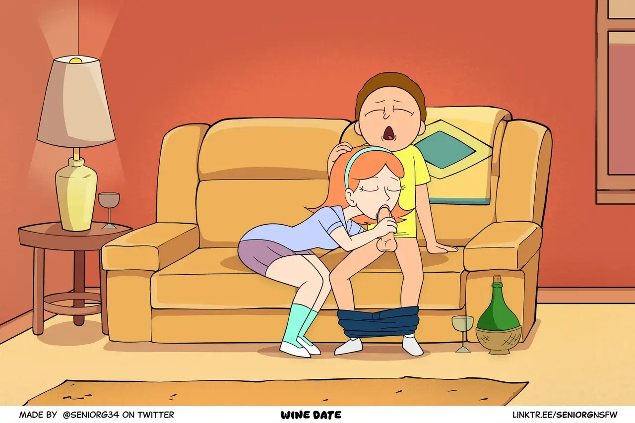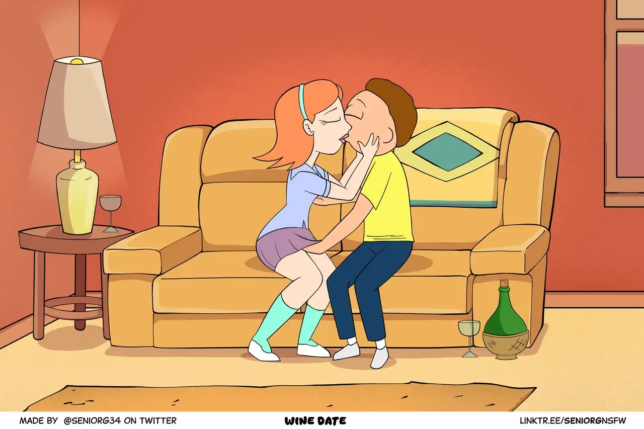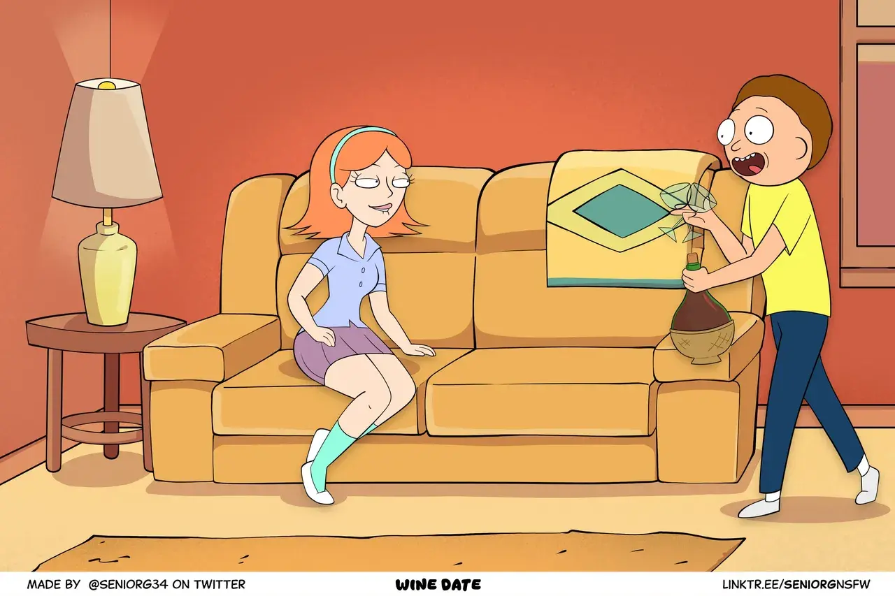 Teniendo sexo con ella boca abajo, Morty penetrándola sin usar protección, y con la gran posibilidad de que se corra dentro. Que es lo que sucede cuando ambos termina. Ahora Morty descansa en la alfombra en el suelo y ella lo hace sobre el sofá toda llena de semen.